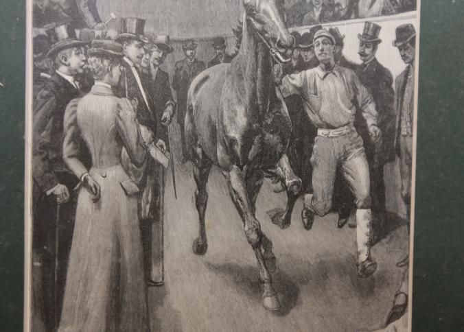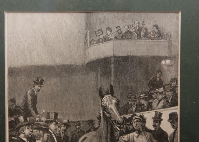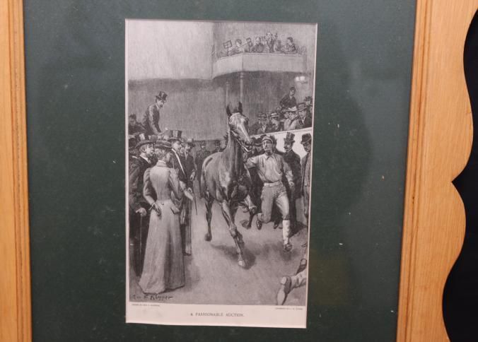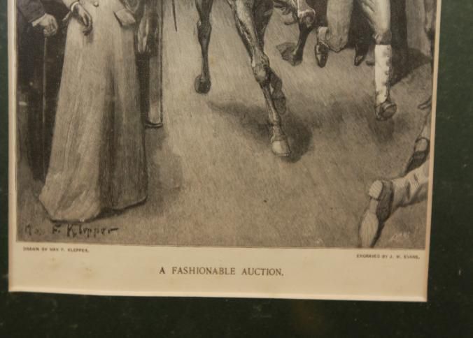 FR. 19THC ENGRAVING OF A HORSE AUCTION "A FASHIONABLE AUCTION". 5X8" FRAMED AND MATTED TO 14X17". GREAT DETAIL SHOWING THE HORSE HANDLER MOVING THE HORSE IN THE RING WHILE AUCTIONEER WITH HAMMER AND TOP HAT CONDUCTS AUCTION TO A WELL DRESSED VICTORIAN CROWD.Created By