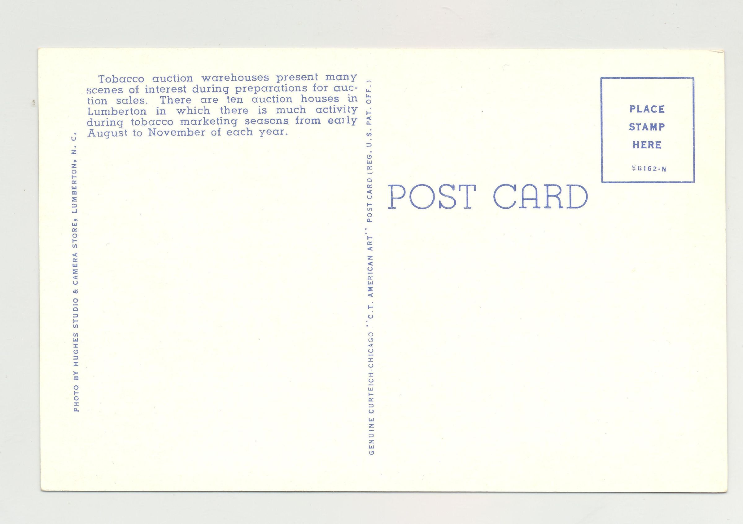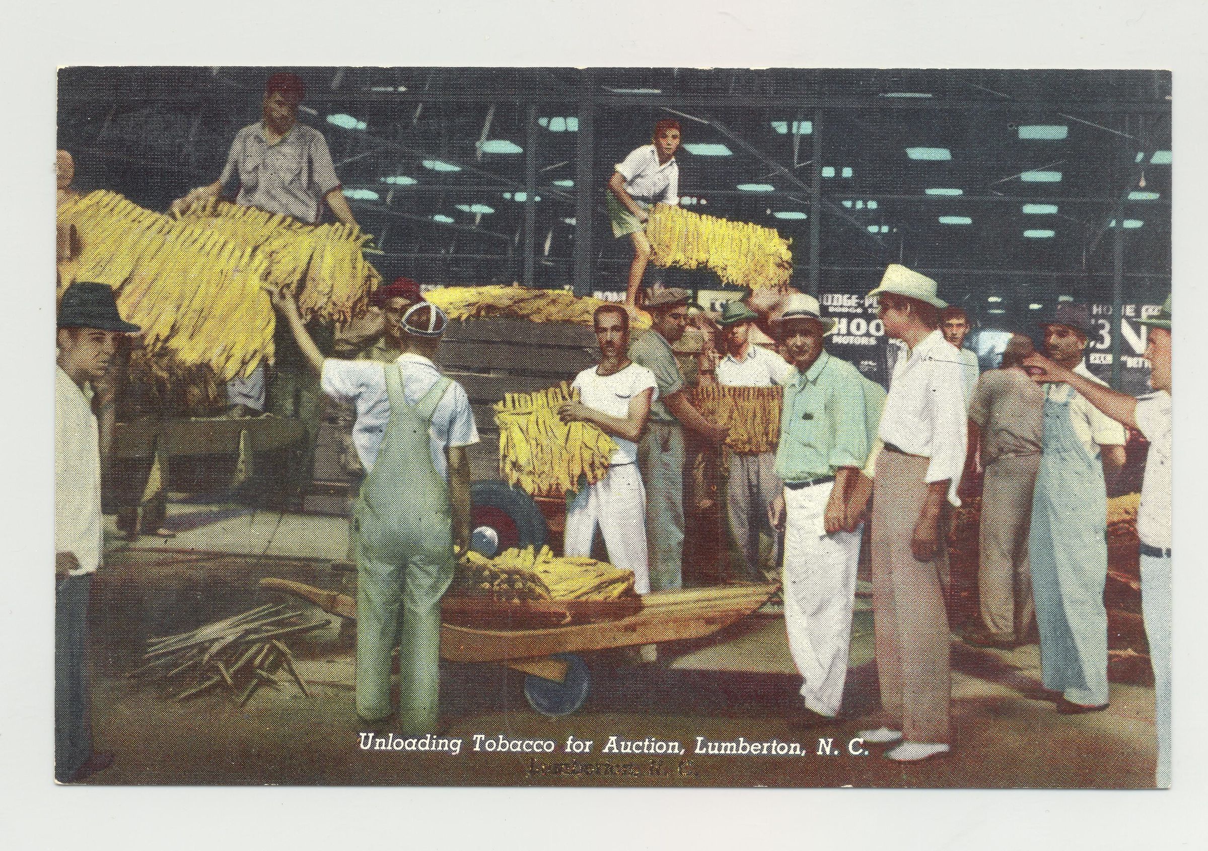 PSTCD, TOBACCO, NC. NO DATE. COLOR PRINT. "UNLOADING TOBACCO FOR AUCTION, LUMBERTON, NC."
