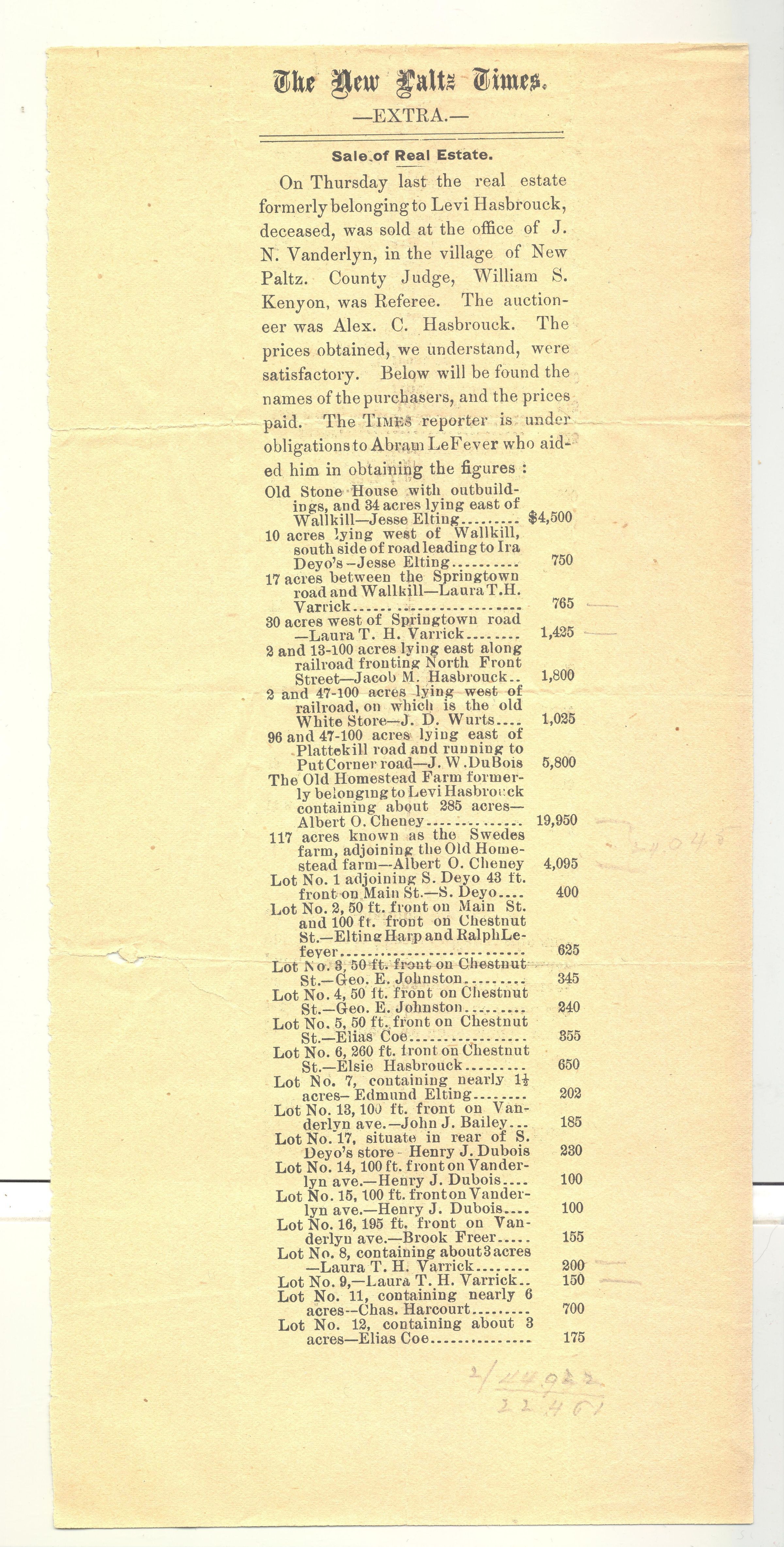 ESTATE SETTLEMENT FROM NYTIMES. REAL ESTATE, LOCAL, NEW PALTZ, NY. NO DATE. LISTED NAMES AND PRICES OF LAND PURCHASES. ALEX HASBROUCK, AUCT.Created By
