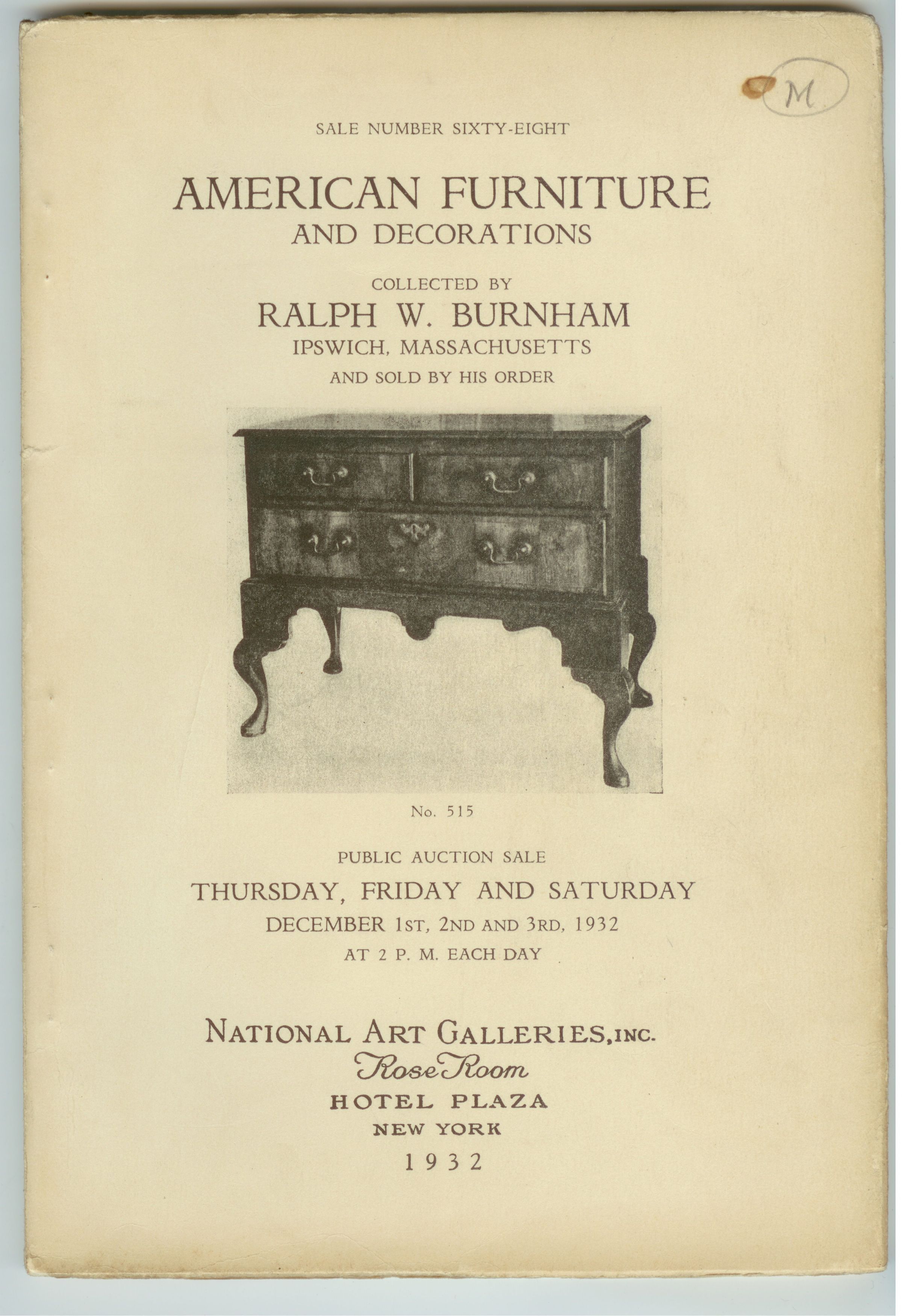 CAT, AMERICAN FURNITURE, 1932, NY. SALE #68, NATIONAL ART GALLERIES. 71 PP, 6 1/4" X 9"