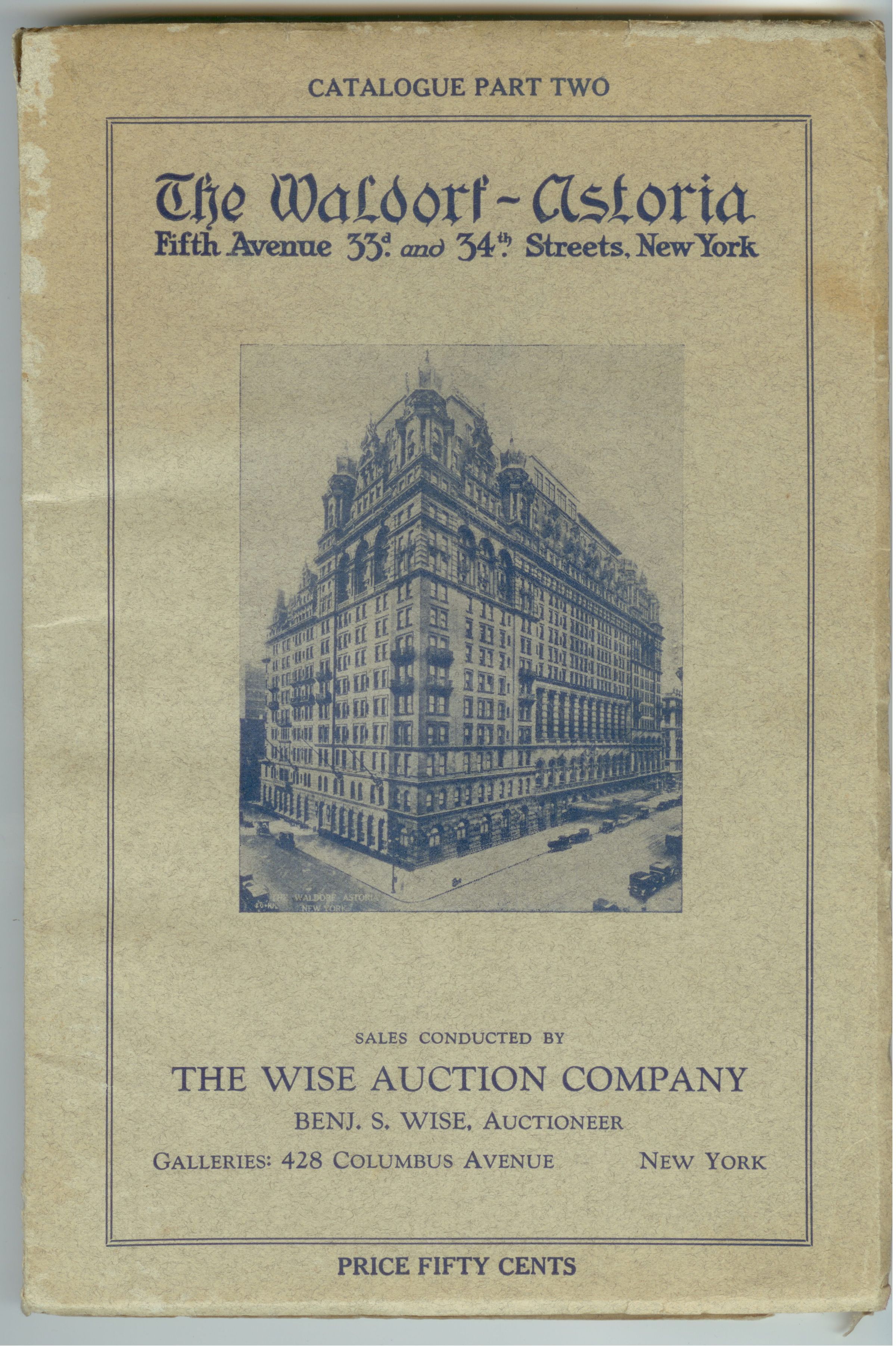 CAT, COMMERICAL LIQUIDATION, 1929, NY. BENJ WISE, AUCT. CATALOGUE PART 2. CONTENTS OF THE WALDORF-ASTORIA HOTEL, NEW YORK CITY. APPROX 150-200 PP, 6" X 9"Created By