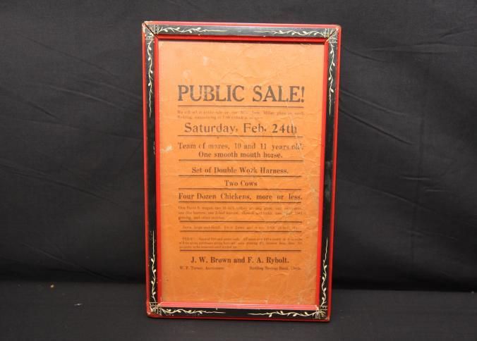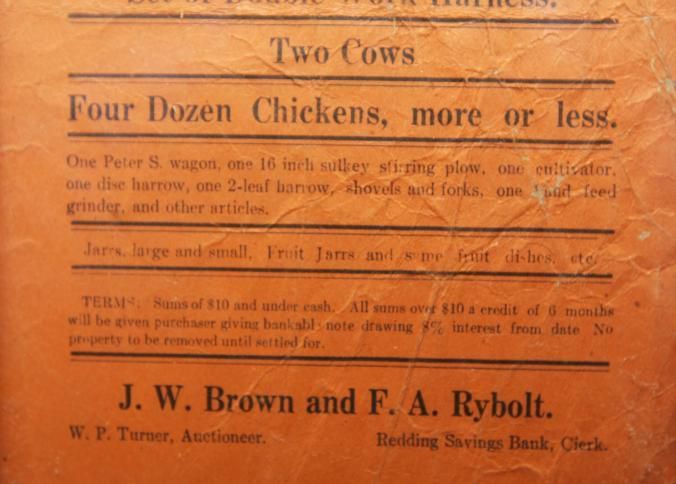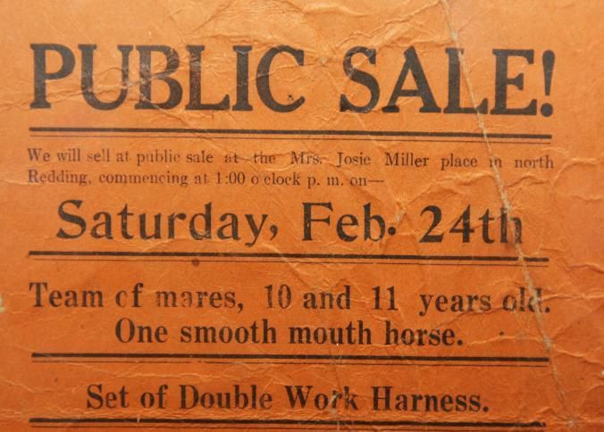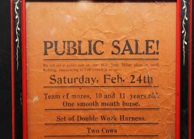 FR. LATE 19THC CA. "PUBLIC SALE!", LIVESTOCK, WAGON, TOOLS - BROADSIDE. 5 1/2X9". AUCTIONEER W.P. TURNER WAS SELLING ITEMS BELONGING TO J.W. BROWN AND F.A. RYBOLT AT "MRS. JOSIE MILLER PLACE IN NORTH REDDING COMMENCING AT 1:00 O'CLOCK P.M. ON SATURDAY, FEB. 24TH..." GOES ON TO DESCRIBE TEAM OF MARES, 10 AND 11 YEARS OLD, ONE SMOOTH MOUTH HORSE, SET OF DOUBLE WORK HARNESS, TWO COWS, 4 DOZE CHICKENS, MORE OR LESS. THEY WERE ALSO OFFERING A "PETER S. WAGON, 16" SULKEY, STIRRING PLOW, 1 CULTIVATOR, 1 DISC HARROW, 1 TWO LEAF HARROW, SHOVELS, FORKS, AND OTHER ARTICLES. TERMS: SUMS UNDER TEN DOLLARS CASH. PURCHASES OVER $10. CREDIT FOR 6 MONTHS AT 8%.Created By