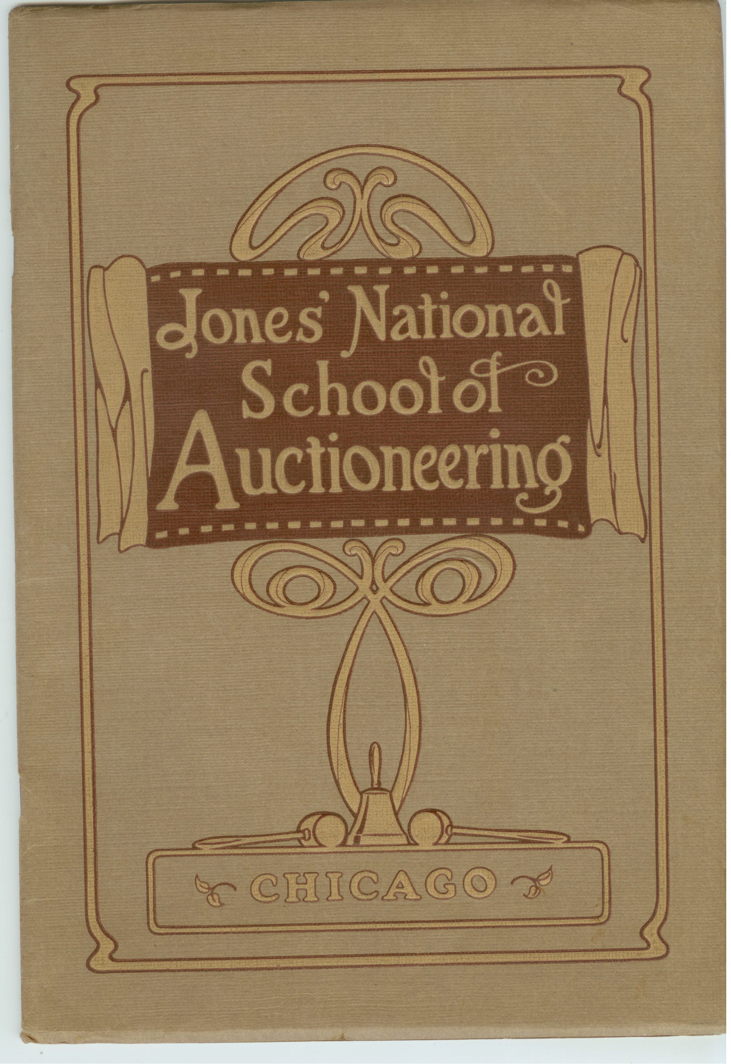 CAT, AUCTION SCHOOL, IL. COPY 1909, JONES' NATIONAL SCHOOL OF AUCTIONEERING. STAMPED UNIV. OF ILLINOIS LIBRARY 1920. PHOTOS, BROWN TYPE. 47 PP. 7" X 10"Created By