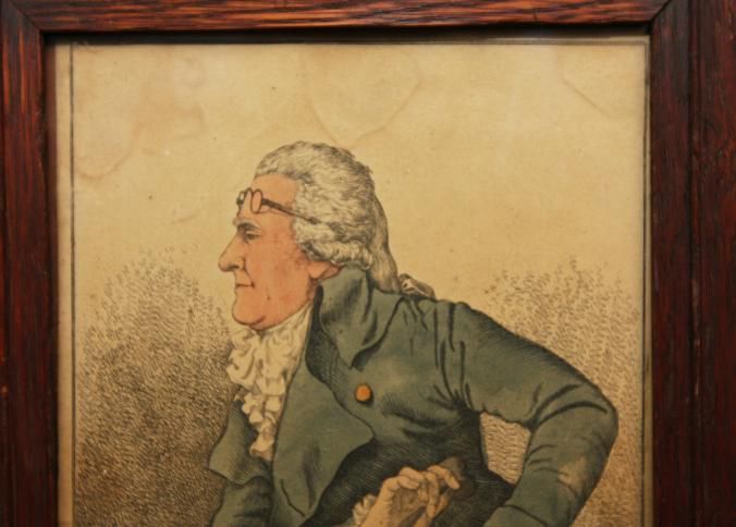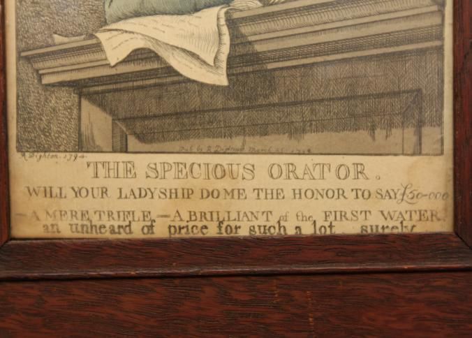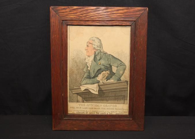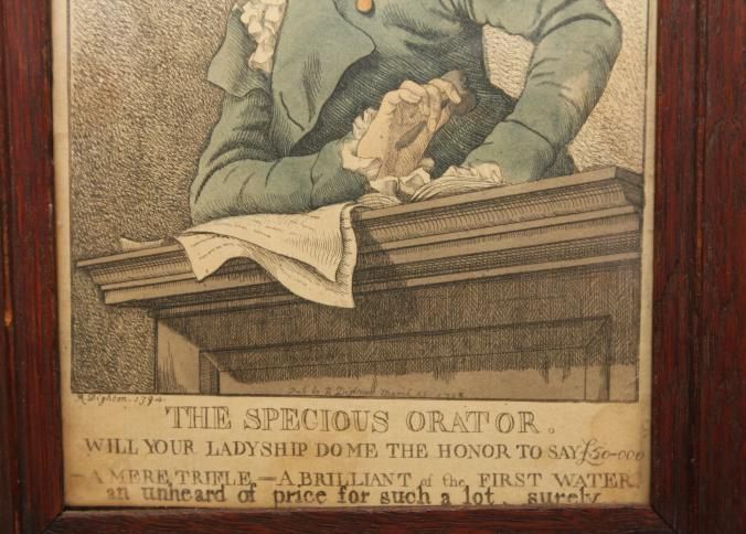 FR. 18THC COLORED ENGRAVING OF AUCTIONEER AT PODIUM. 5 1/2X7 1/2". "THE SPECIOUS ORATOR" THERE IS A QUOTE BELOW TITLE "WILL YOUR LADYSHIP DO ME THE HONOR TO SAY (50 POUNDS) - A MERE TRIFLE - A BRILLIANT OF THE FIRST WATER - AN UNHEARD OF PRICE FOR SUCH A LOT - SURELY." oBVIOUSLY AN ENGLISH AUCTIONEER WITH WHIG.Created By