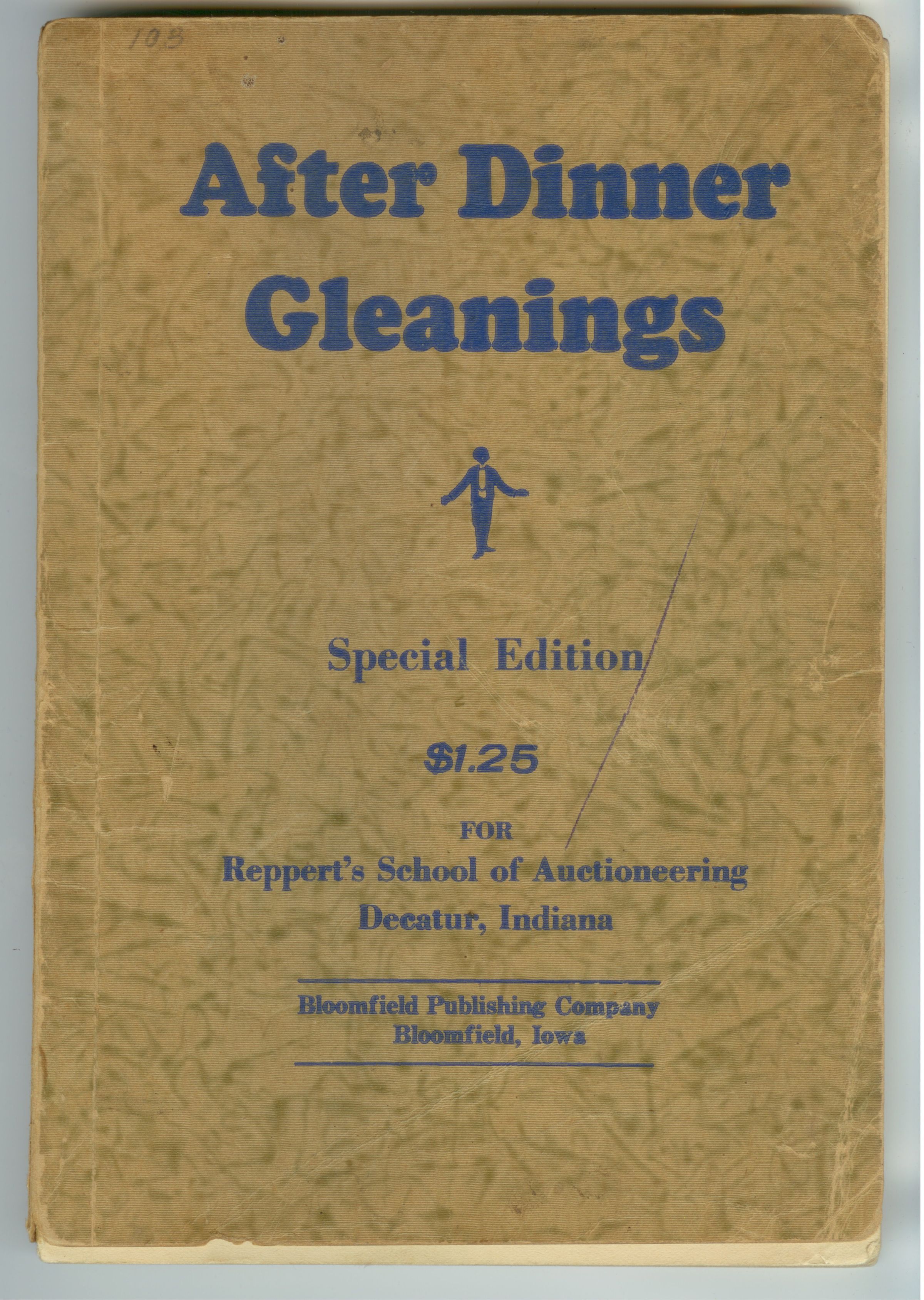BKLT, AUCTION SCHOOL, 1930, IA. "AFTER DINNER GLEANINGS" PUBL. BY REPPERT'S SCHOOL OF AUCTIONEERING. SPECIAL ED. BLOOMSFIELD PUBL. CO. 133 PP. 6" X 8 1/2"Created By
