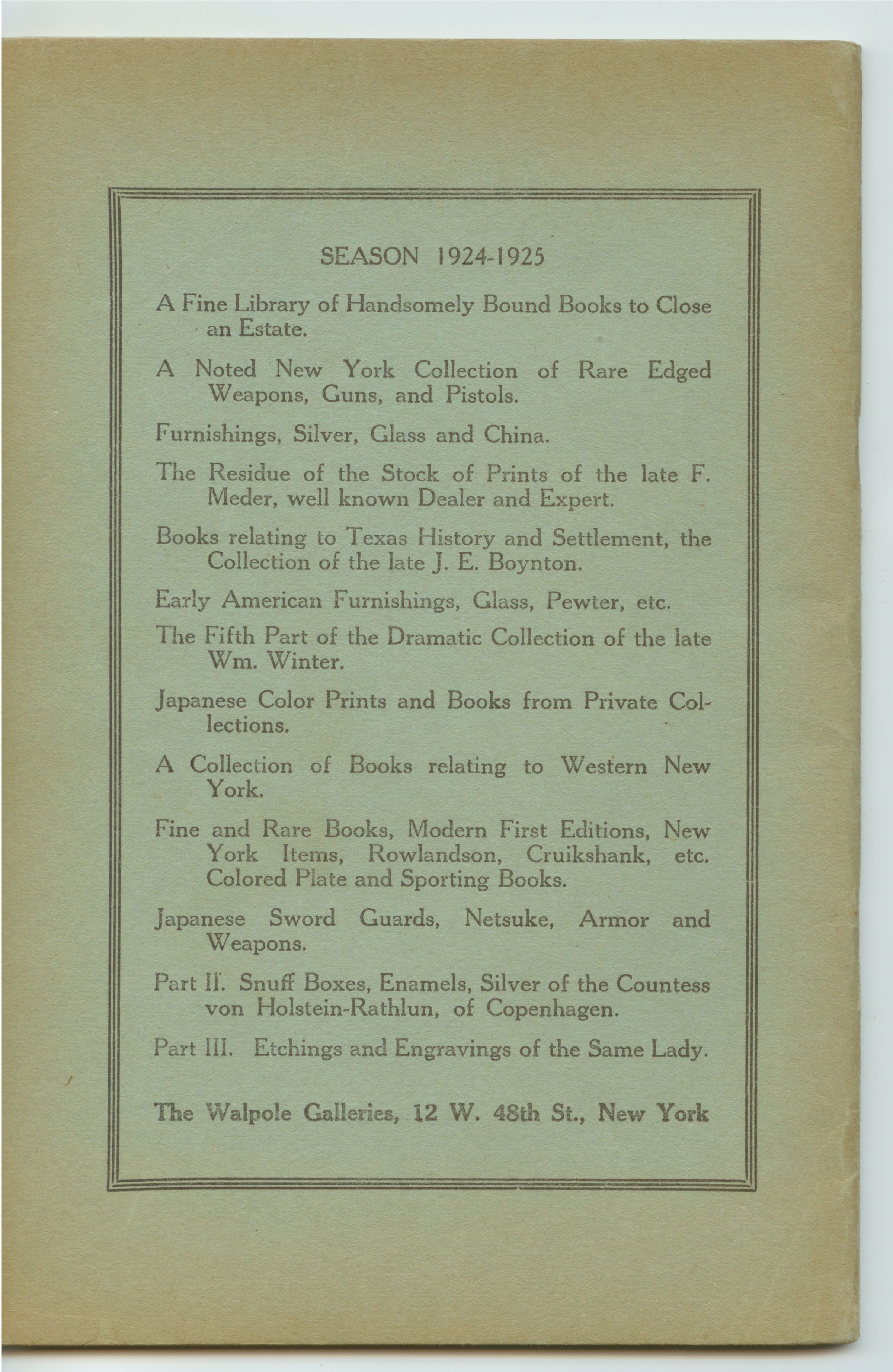 CAT, AMERICAN INDIAN, 1925, NY. INDIAN BASKETS, SPURS, BITS, DAGGERS, ETC. THE WALPOLE GALLERIES. 50 PP. 6" X 9"Created By