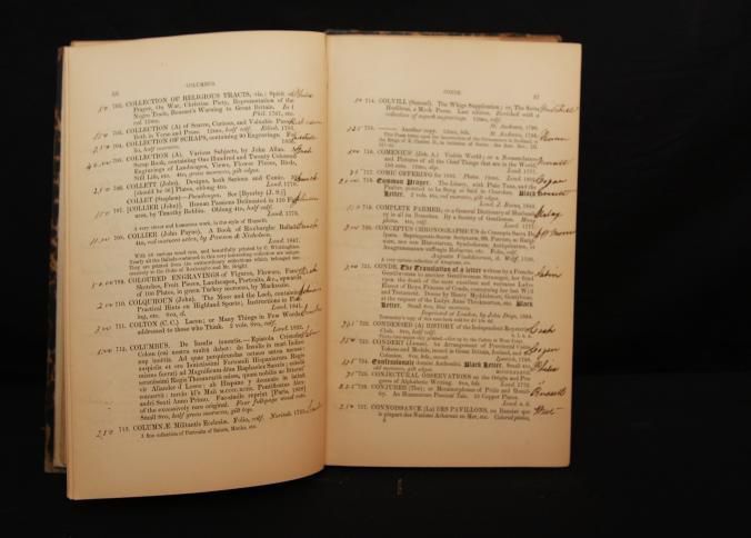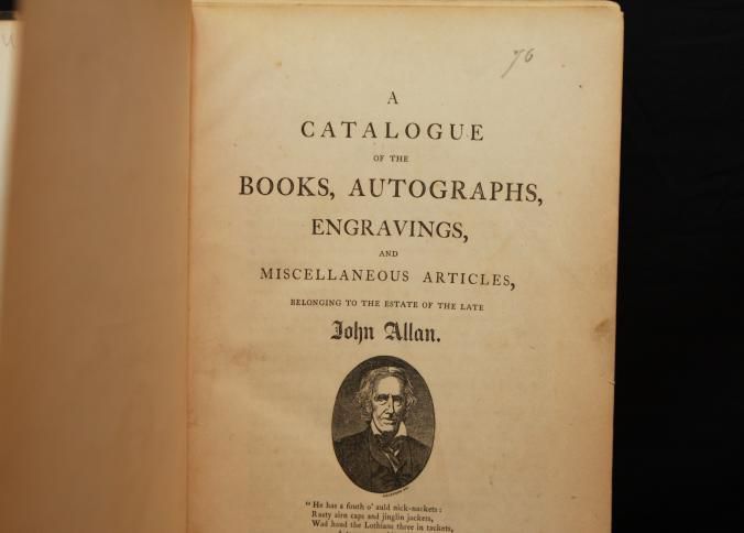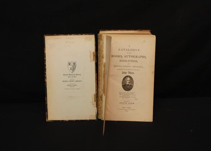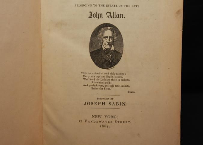 CAT, ESTATE, 1864, NY. BOOKS, AUTOGRAPH LETTERS, ENGRAVINGS, COINS, ETC. ESTATE OF JOHN ALLAN. JOSEPH SABIN, AUCT. BOUND HARDCOVER BOOK, SOME DAMAGE. INCL INDEX. PRICES AND BUYERS WRITTEN IN, 343 PP. 6" X 9" AND 1" THICKCreated By