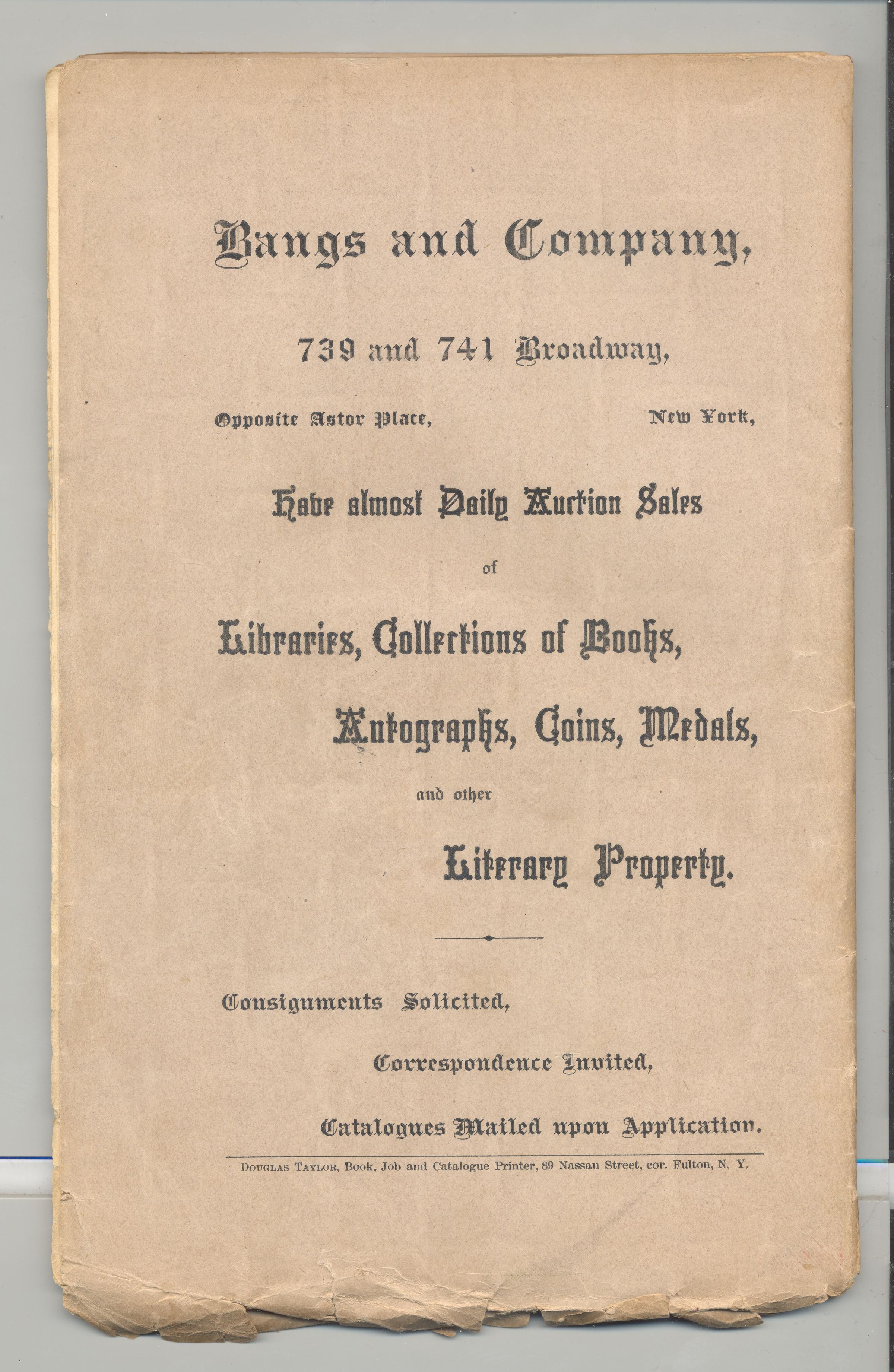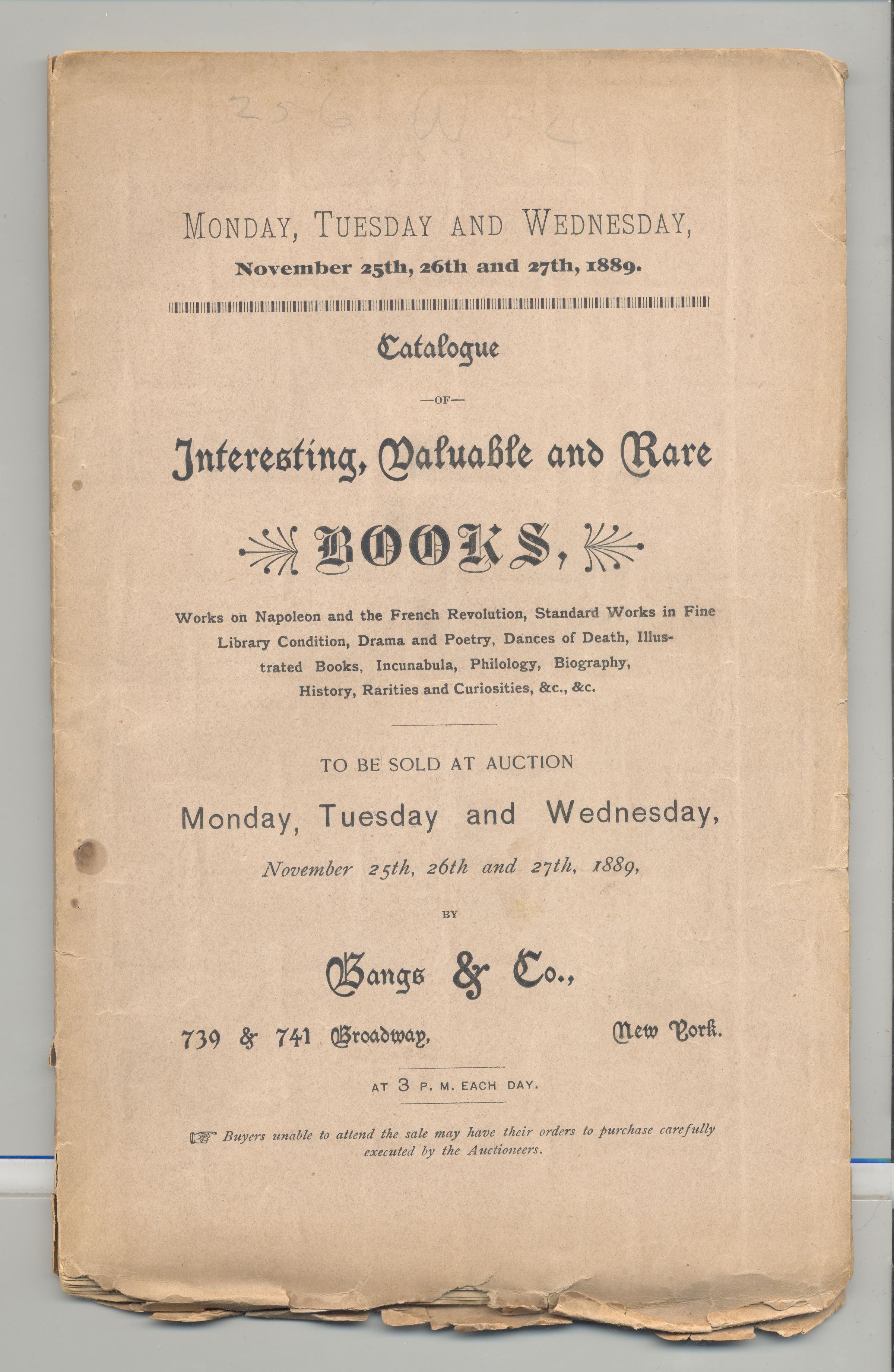 CAT, BOOKS, 1889, NY. BANGS & CO, AUCTS. A FEW PRICES NOTED. 103 PP. 6" X 9.5"