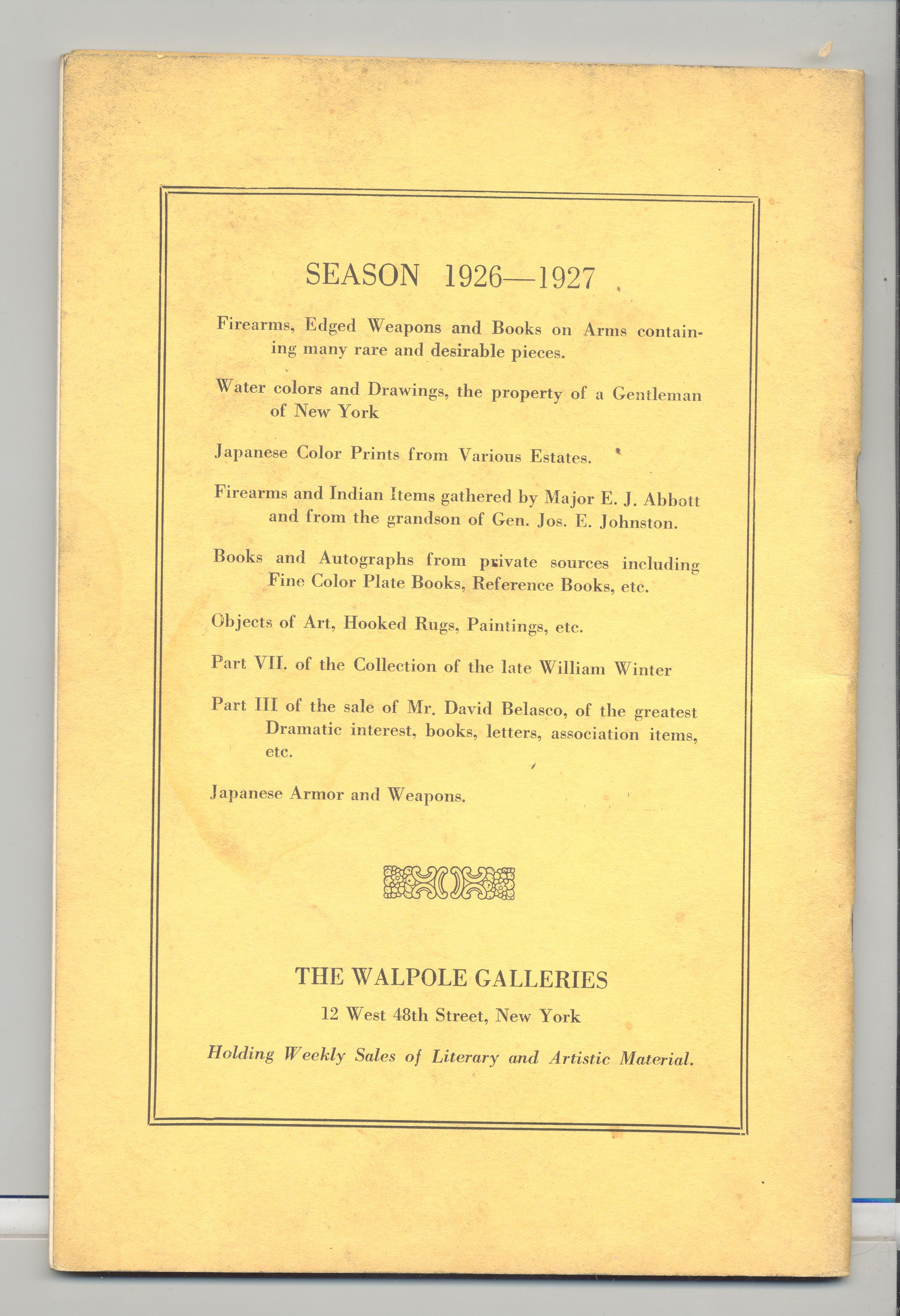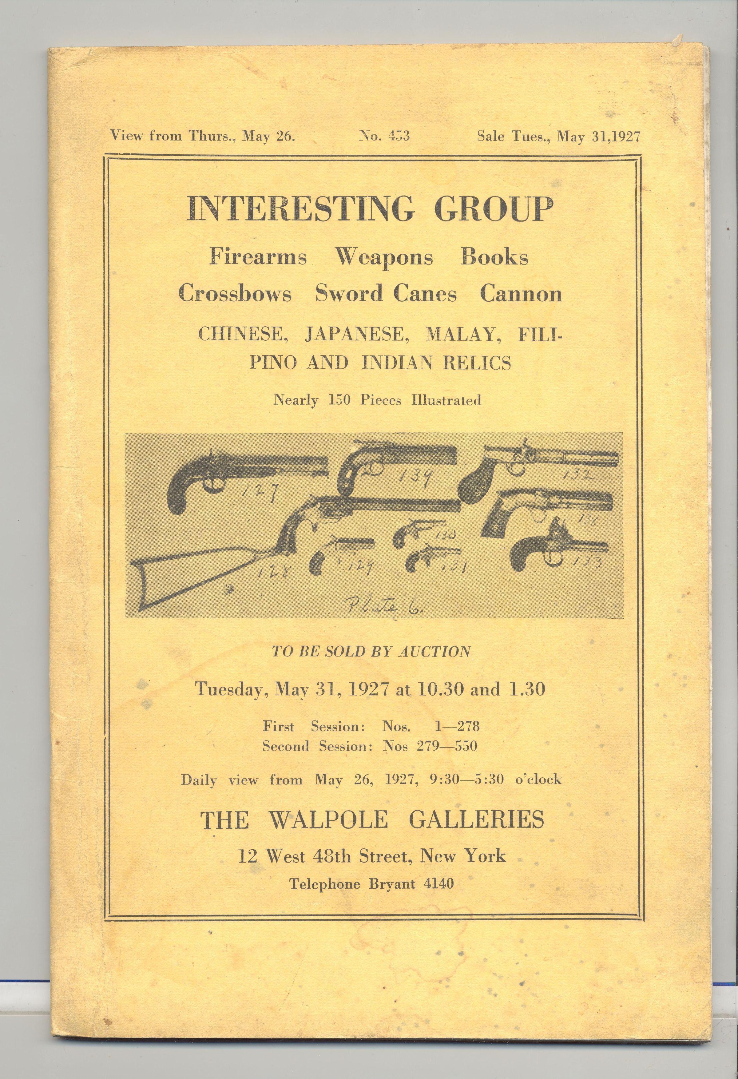 CAT, WEAPONS, 1927, NY. THE WALPOLE GALLERIES. FIREARMS, BOOKS, CROSSBOWS, SWORD CANES, CANNON. ASIAN, INDIAN RELICS. B/W PHOTOS, 63 PP. 6" X 9"Created By