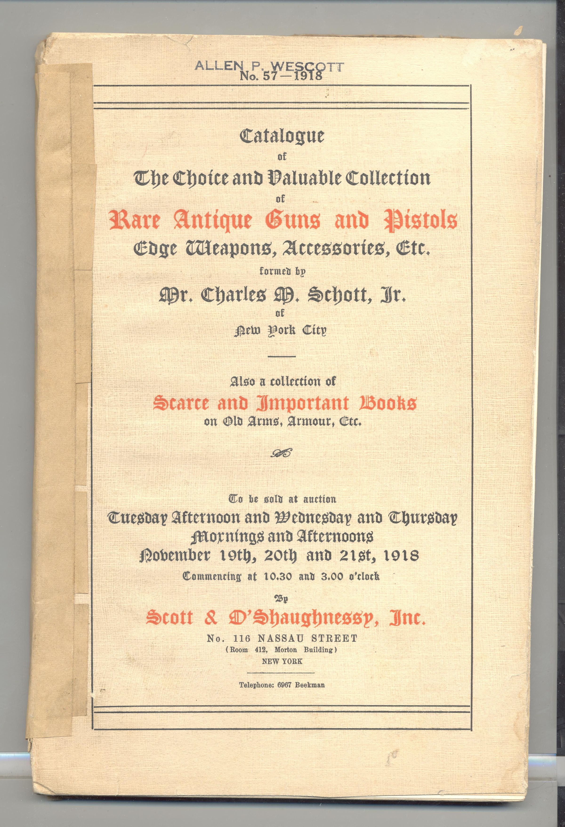 CAT, WEAPONS, 1918, NY. ANTIQUE GUNS, PISTOLS, EDGE WEAPONS, ACCESSORIES, COLLECTION OF CHARLES SCHOTT, JR. SCOTT & O'SHAUGHNESSY, INC, AUCTS. PRICES WRITTEN, B/W PHOTOS, 103 PP, 45 PLATES, 6" X 9"Created By