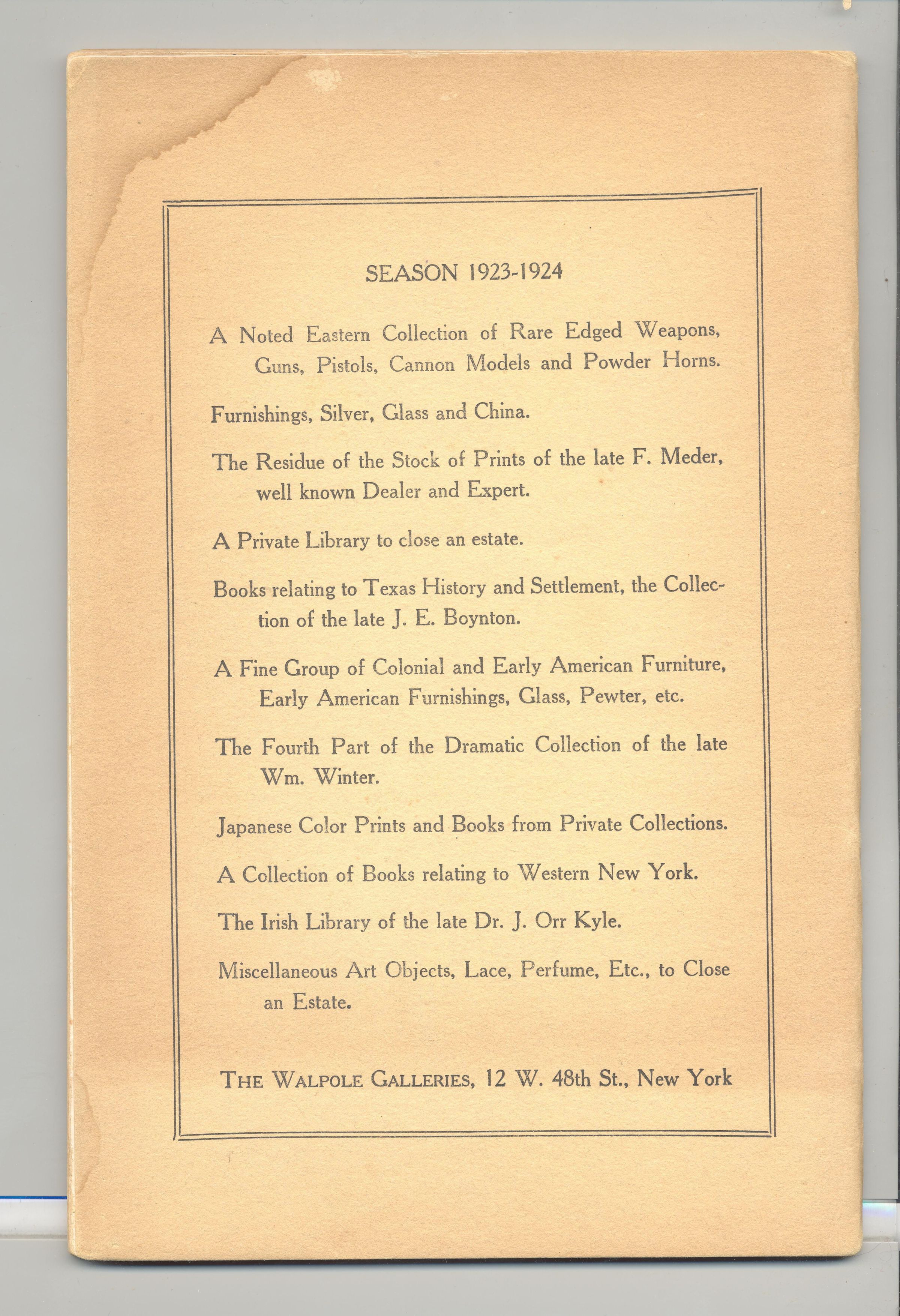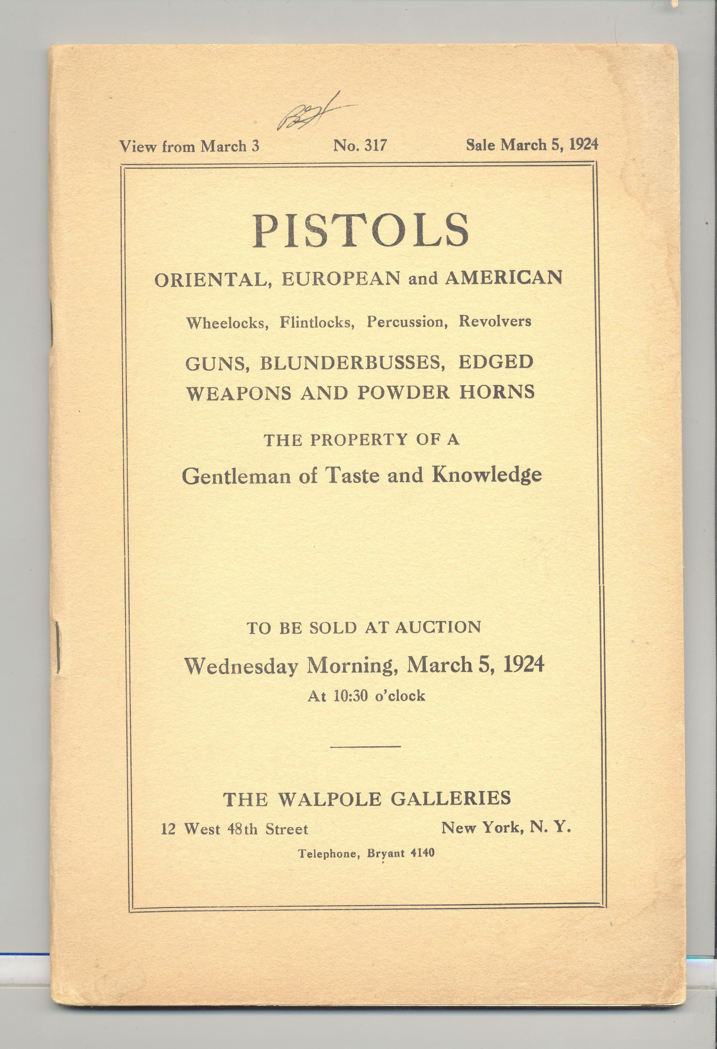 CAT, WEAPONS, 1924, NY. PISTOLS, ORIENTAL, EUROPEAN & AMERICAN. POWDERHORNS, EDGE WEAPONS, GUNS. THE WALPOLE GALLERIES. 45 PP. B/W PHOTOS, 6" X 9"Created By