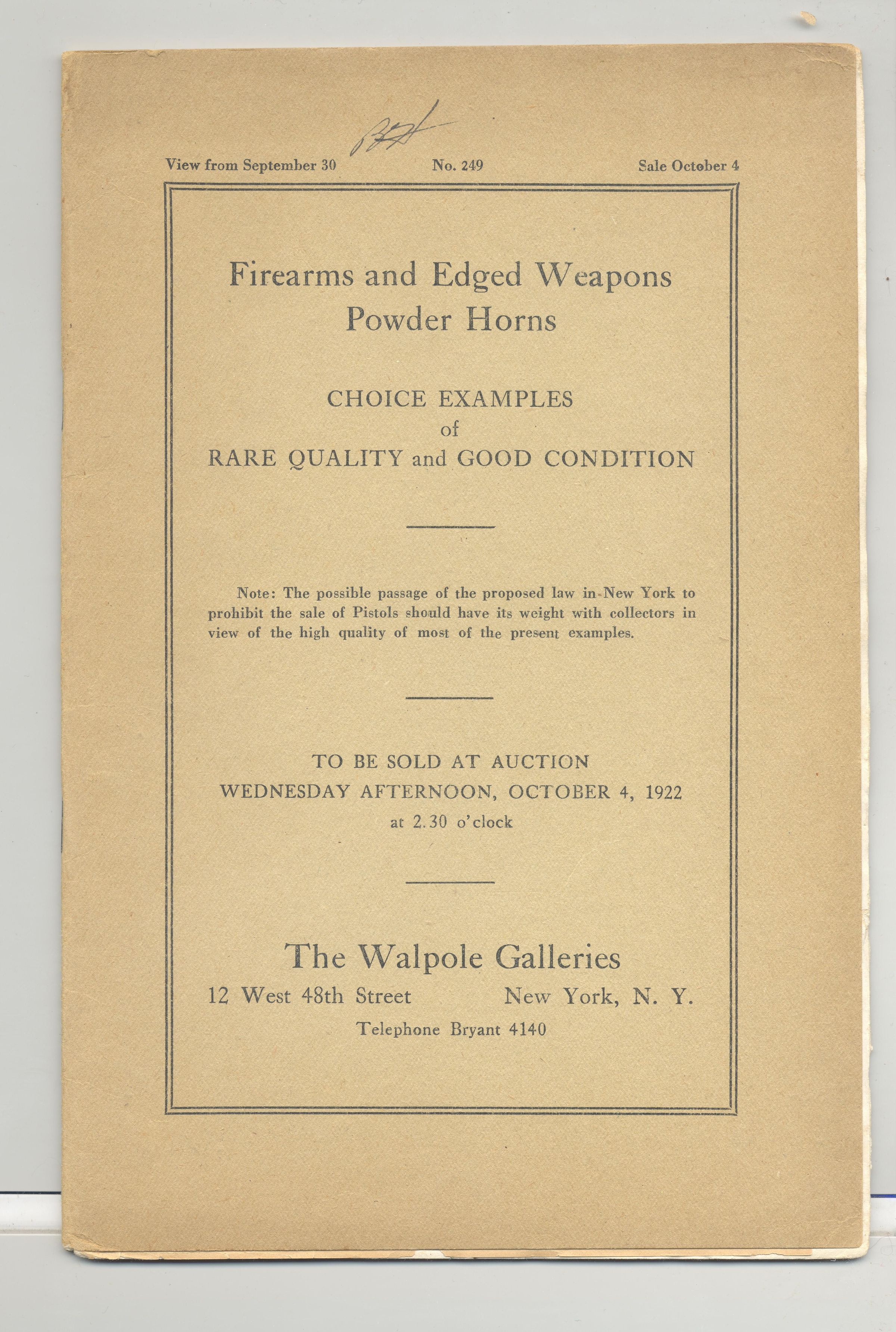 CAT, WEAPONS, 1922, NY. FIREARMS & EDGED WEAPONS, POWDERHORNS. WALPOLE GALLERIES. B/W PHOTOS 35 PP. 6" X 9"Created By