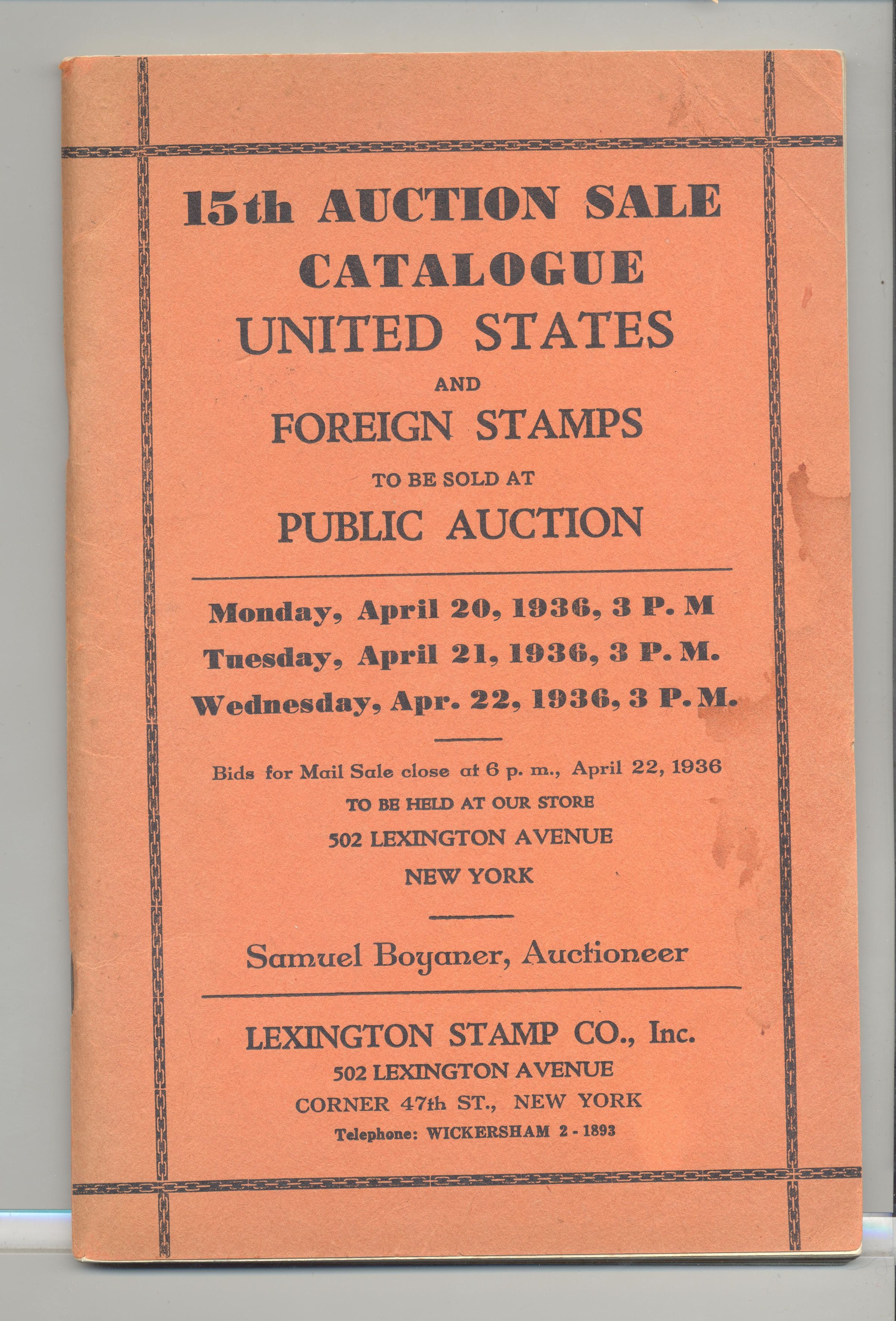 CAT, STAMPS, 1936, NY. 15TH AUCTION SALE, UNITED STATES AND FOREIGN, LEXINGTON STAMP CO, INC. SAMUEL BOYANER, AUCT. 92 PP. 6" X 9"Created By
