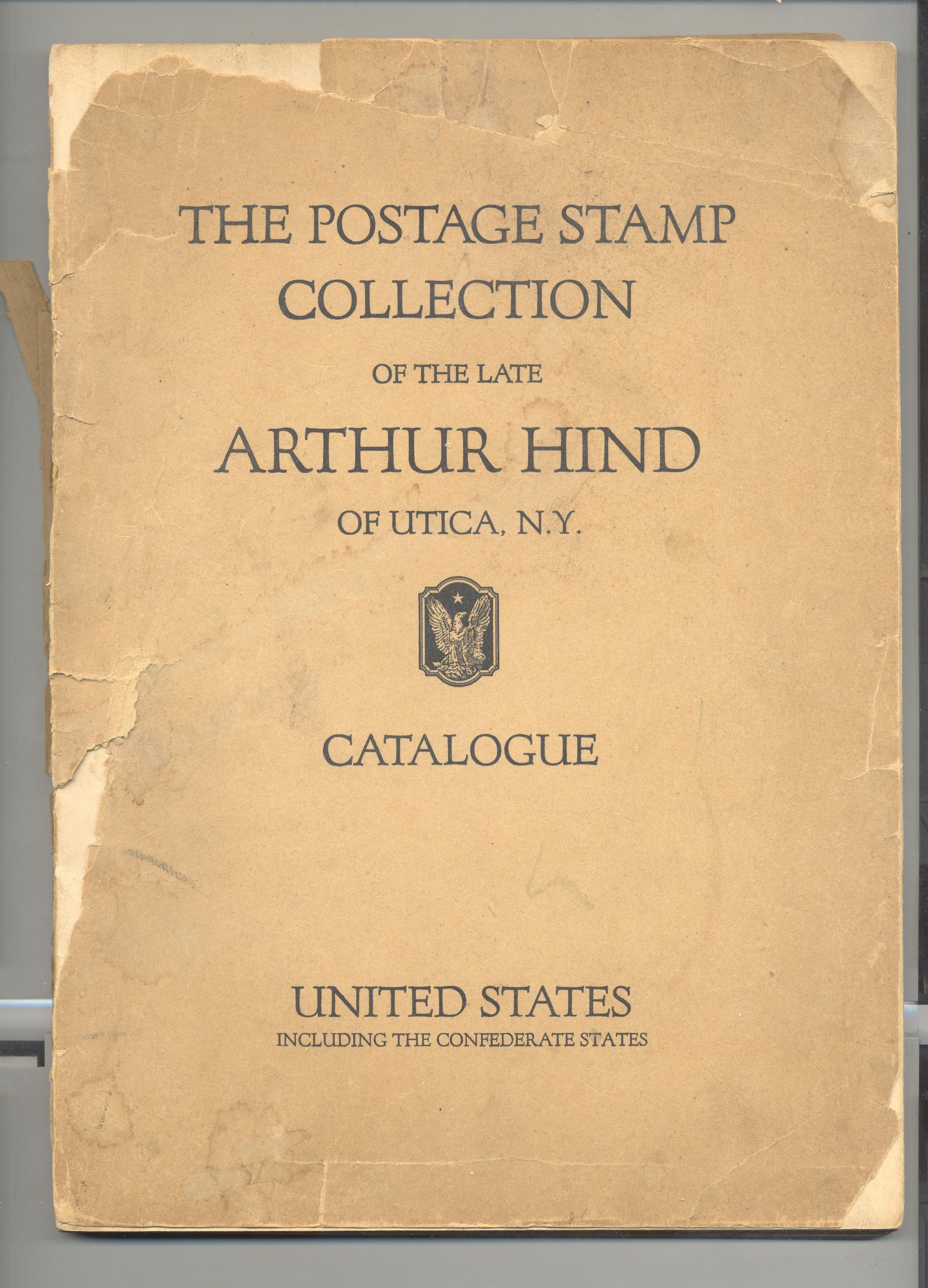 CAT, STAMPS, 1933, NY. ESTATE OF ARTHUR HIND. WALTER SCOTT, AUCT. SOME PRICES WRITTEN, 109 PP. 7 3/4" X 10 1/2". ADDENDA INCL.Created By