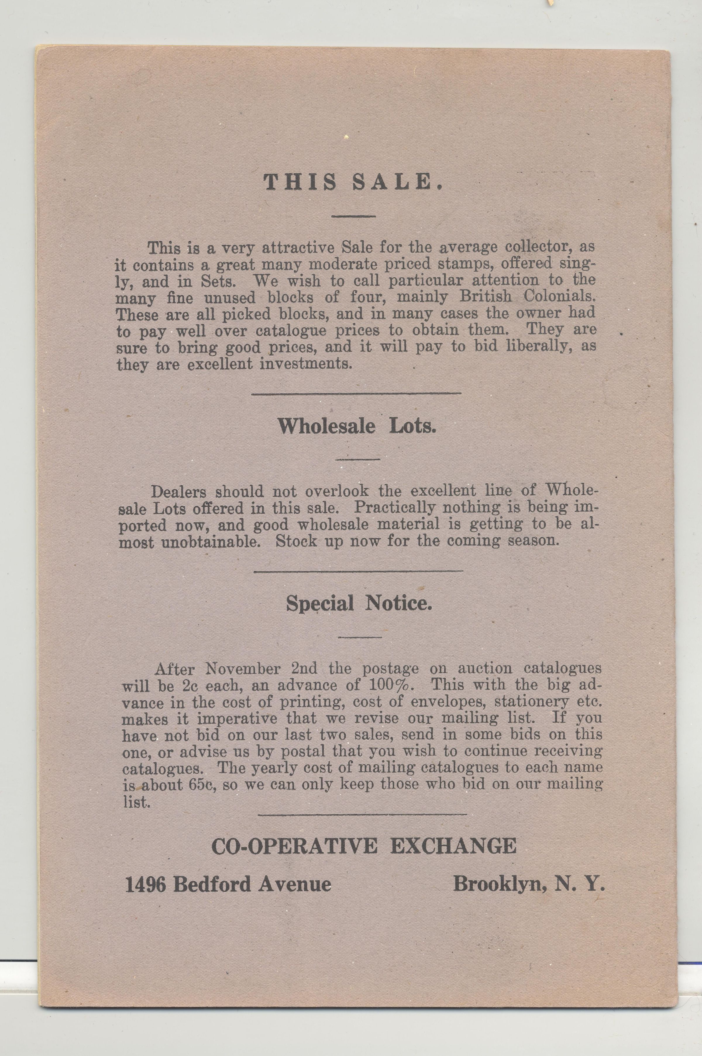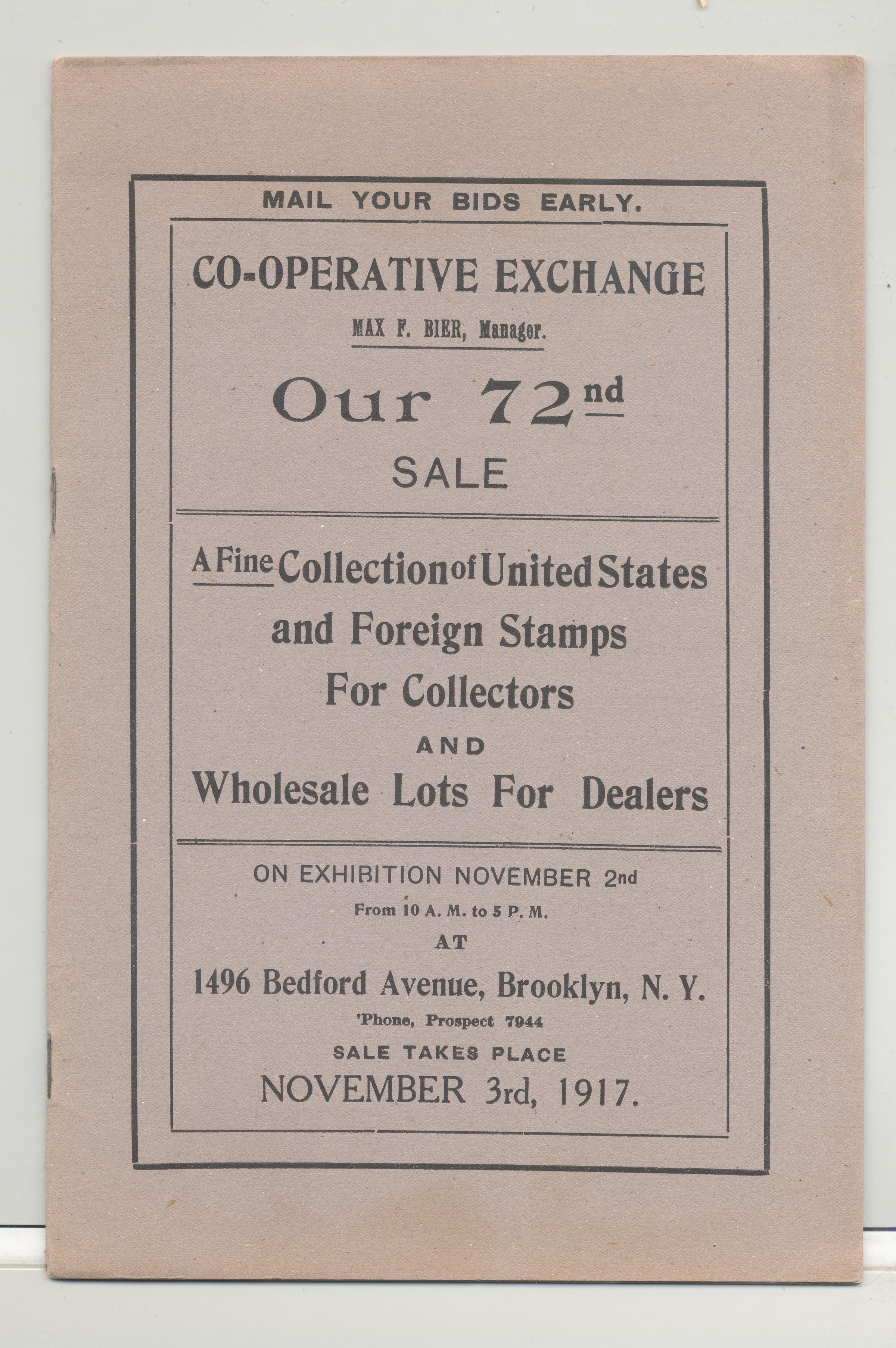CAT, STAMPS, 1917, NY. CO-OPERATIVE EXCHANGE, 72ND SALE, 25 PP. 6" X 9"