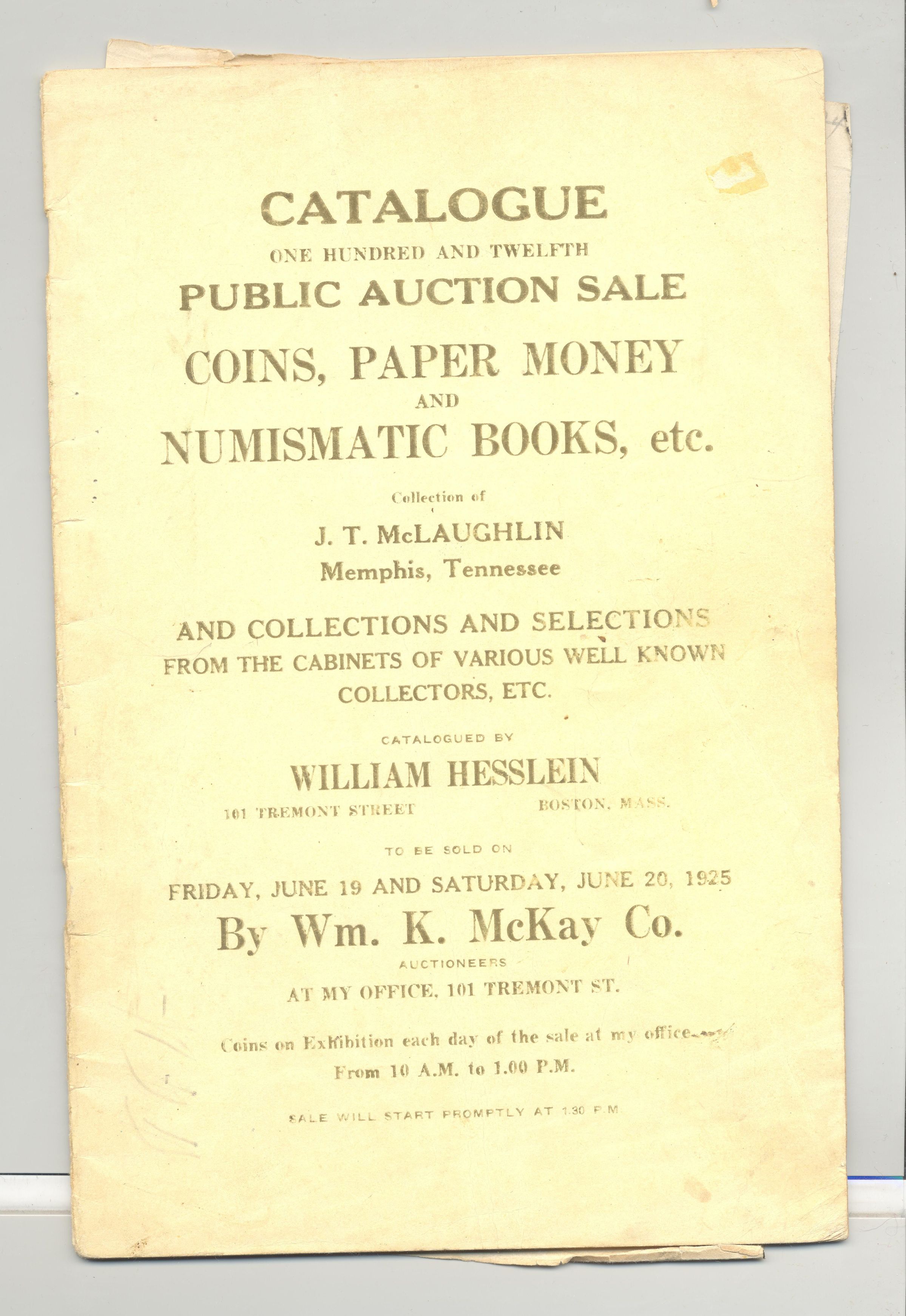 CAT, COINS, 1925, MA. 112TH SALE, COINS, PAPER MONEY & NUMISMATIC BOOKS. WM MCKAY CO, AUCT. INCL BILL TO BUYER. SOME PRICES, 39 PP. 6" X 9"Created By