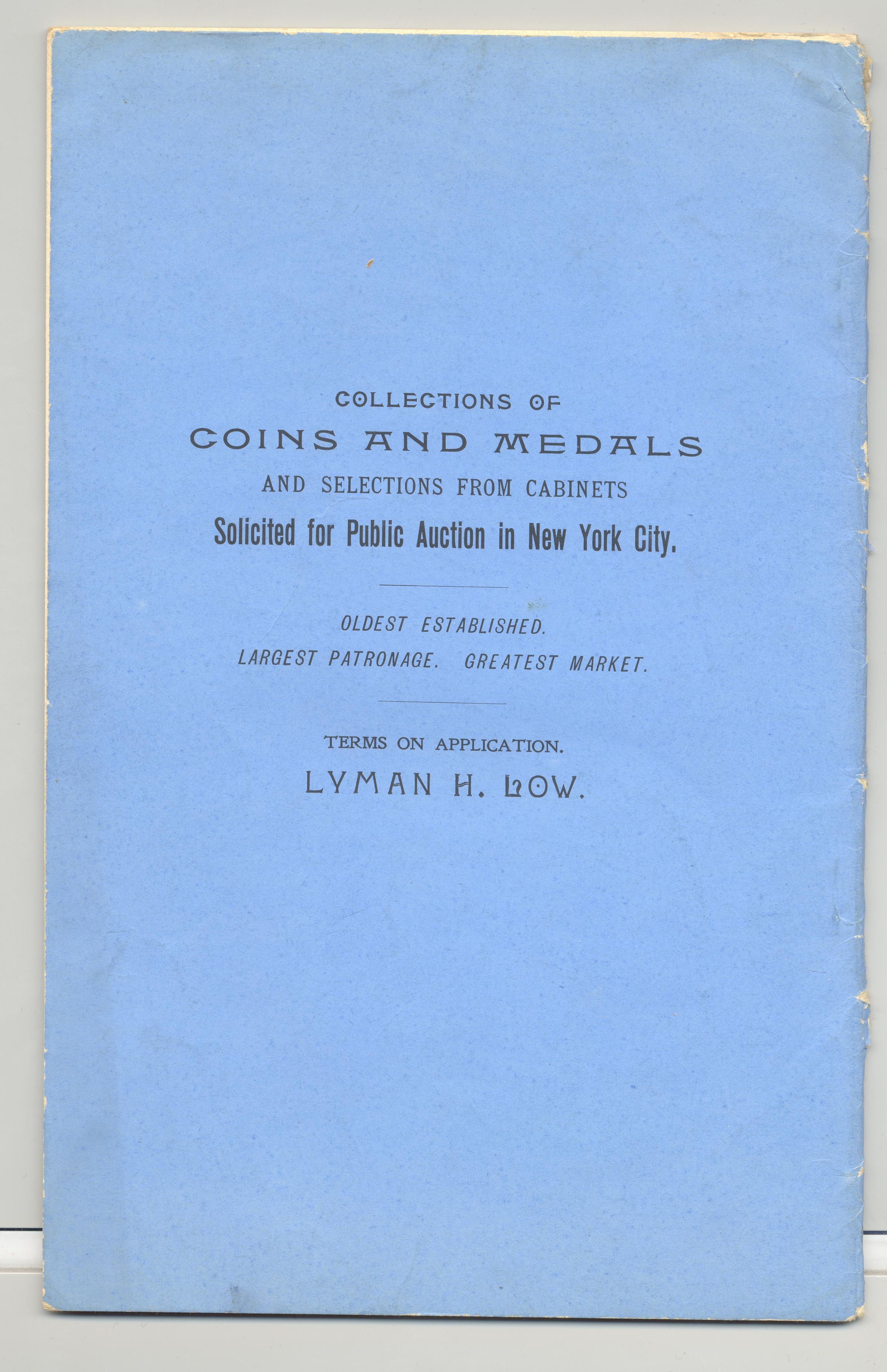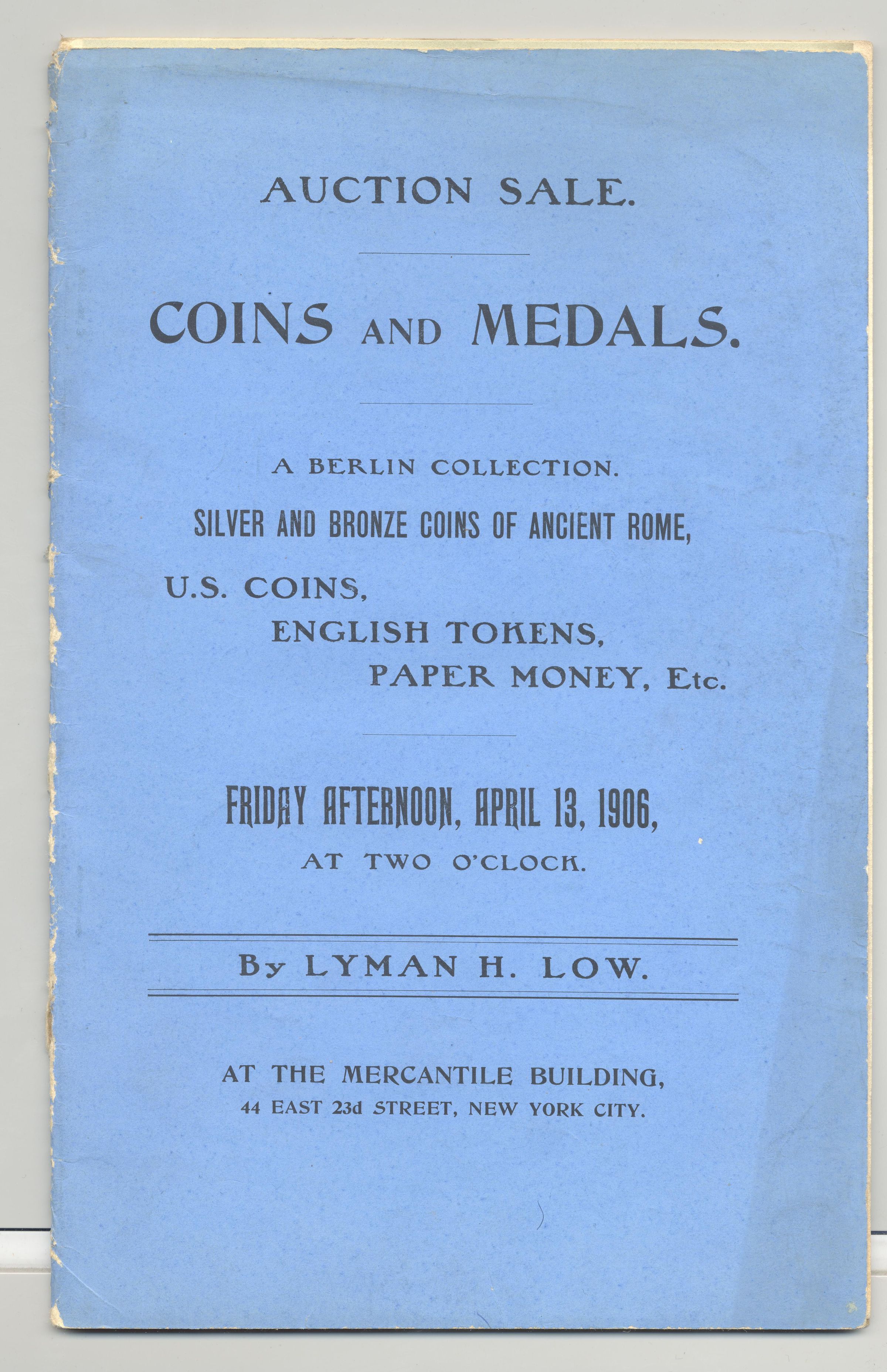 CAT, COINS, 1906, NY. COINS & MEDALS, BERLIN COLLECTION, ANCIENT ROME SILVER AND BRONZE, ENGLISH TOKENS, PAPER MONEY. PRICES WRITTEN, 32 PP, 6" X 9"Created By