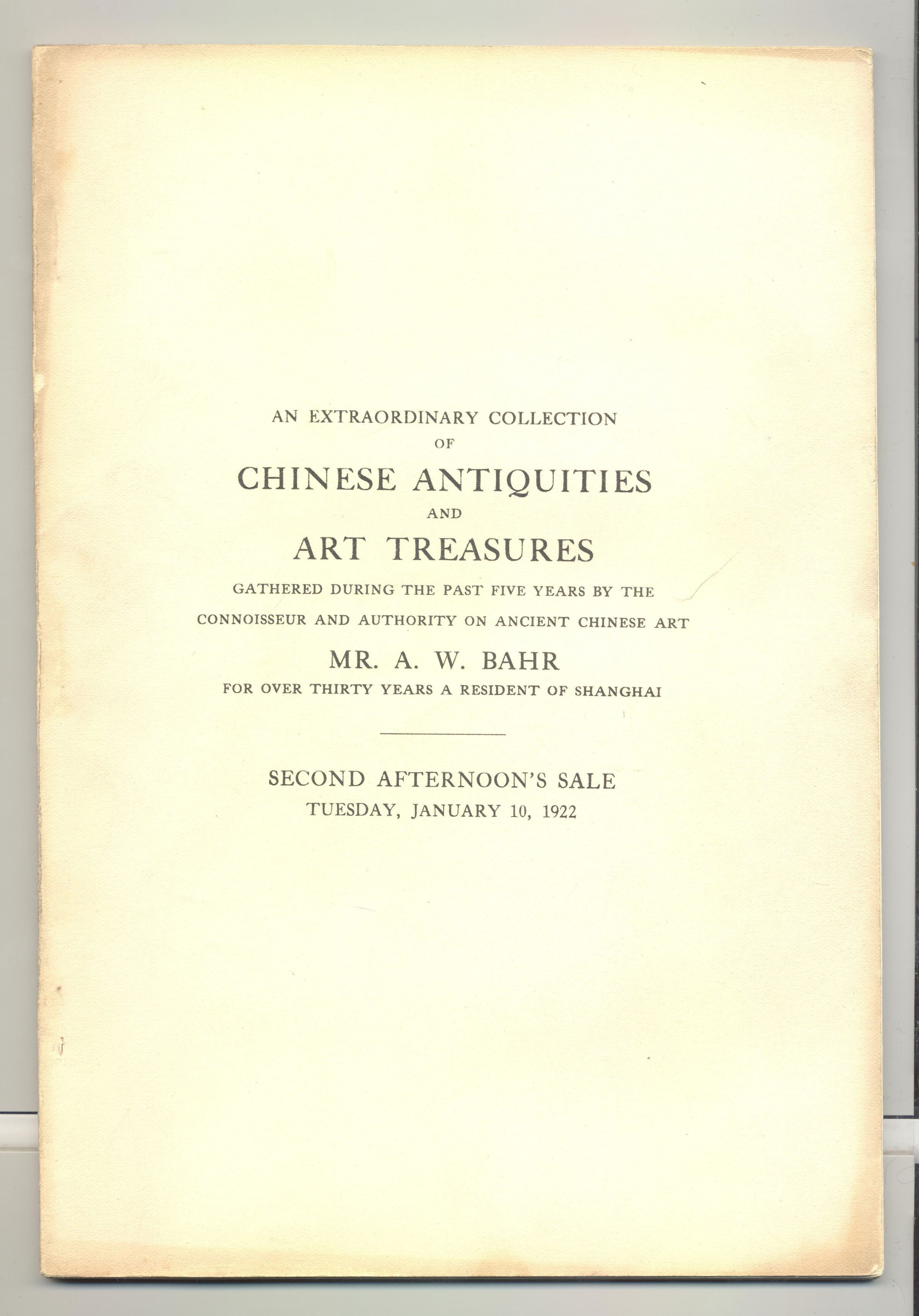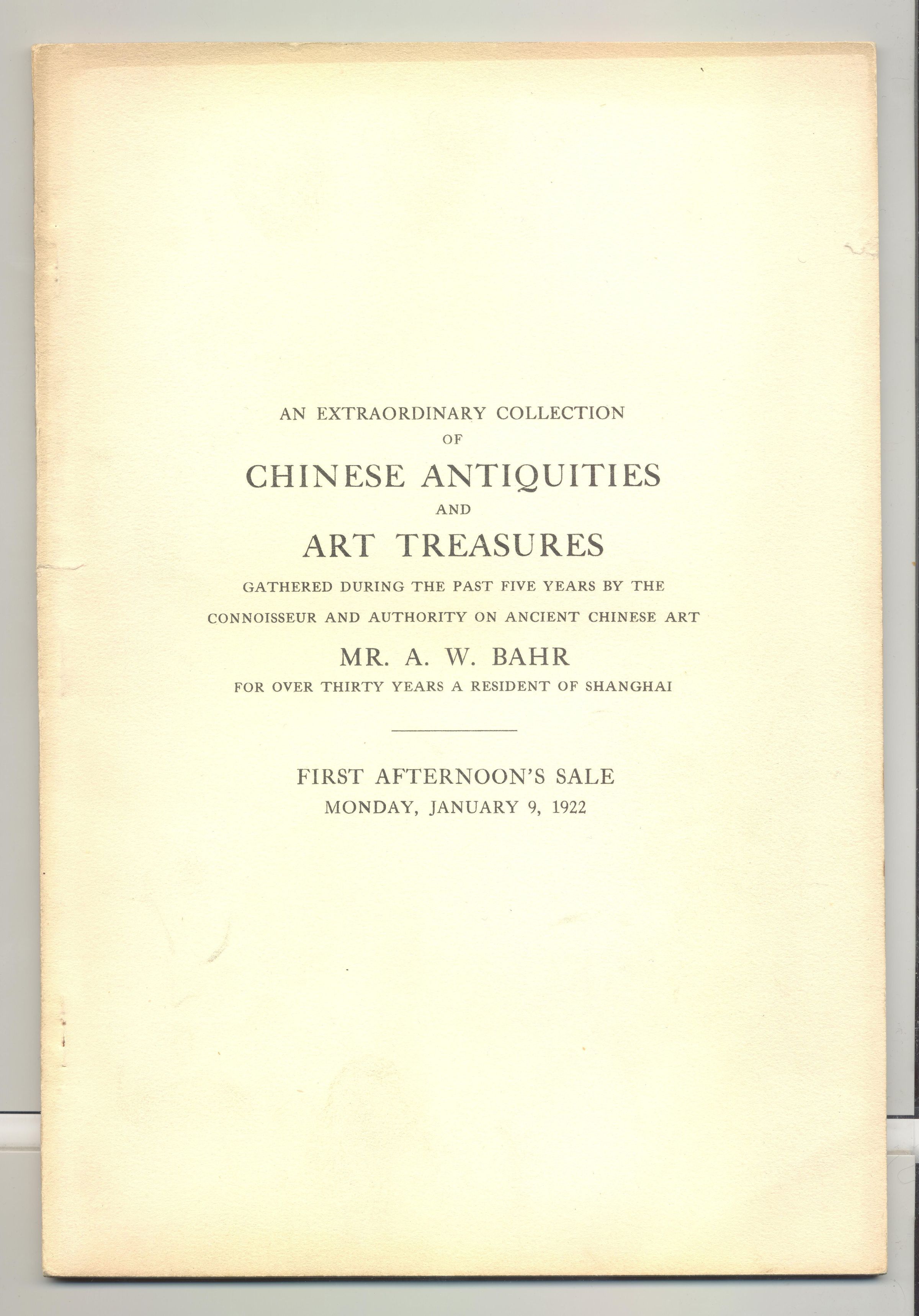 CAT, ART, 1922, NY. CHINESE ANTIQUITIES, ART TREASURES, COLLECTION OF A.W. BAHR. 3 VOL, 3 AFTERNOON SALES. AMERICAN ART ASSOC, AMERICAN ART GALLERY. PRICES WRITTEN, APPROX 100 PP ALTOGETHER, 6 3/4" X 9 3/4"Created By