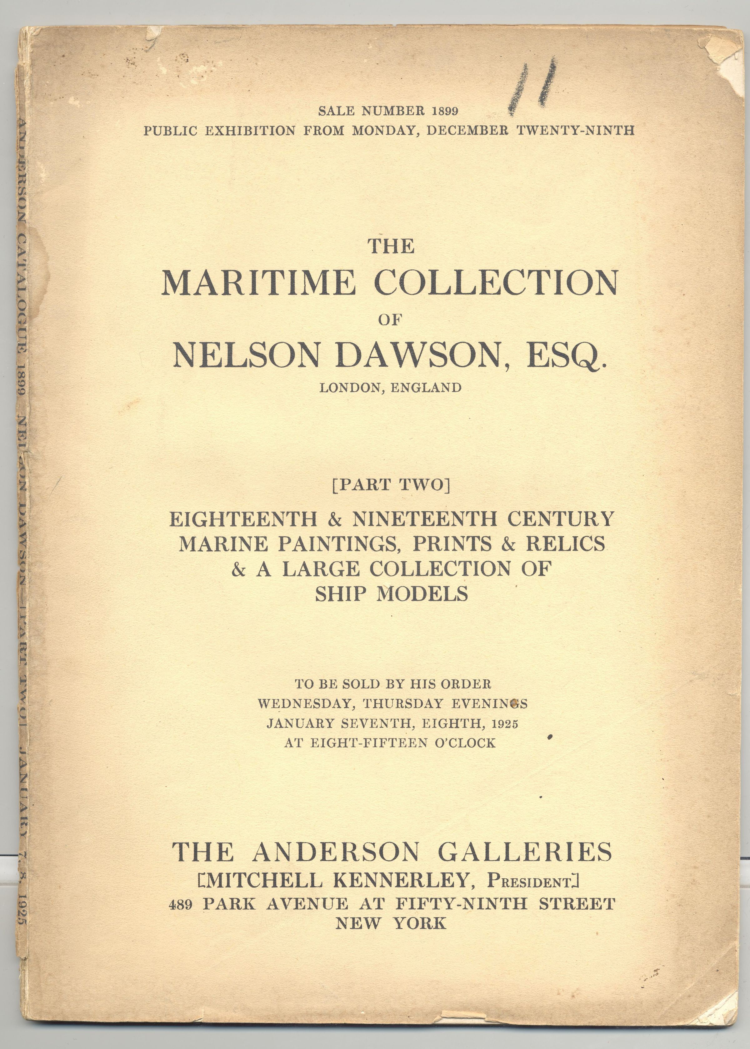 CAT, ART, 1925, NY. THE MARITIME COLLECTION OF NELSON DAWSON, ESQ, LONDON. 18TH & 19TH C MARINE PAINTINGS, PRINTS, RELICS, SHIP MODELS. THE ANDERSON GALLERIES, PRICES WRITTEN, 48 PP. 7 1/4" X 10"Created By