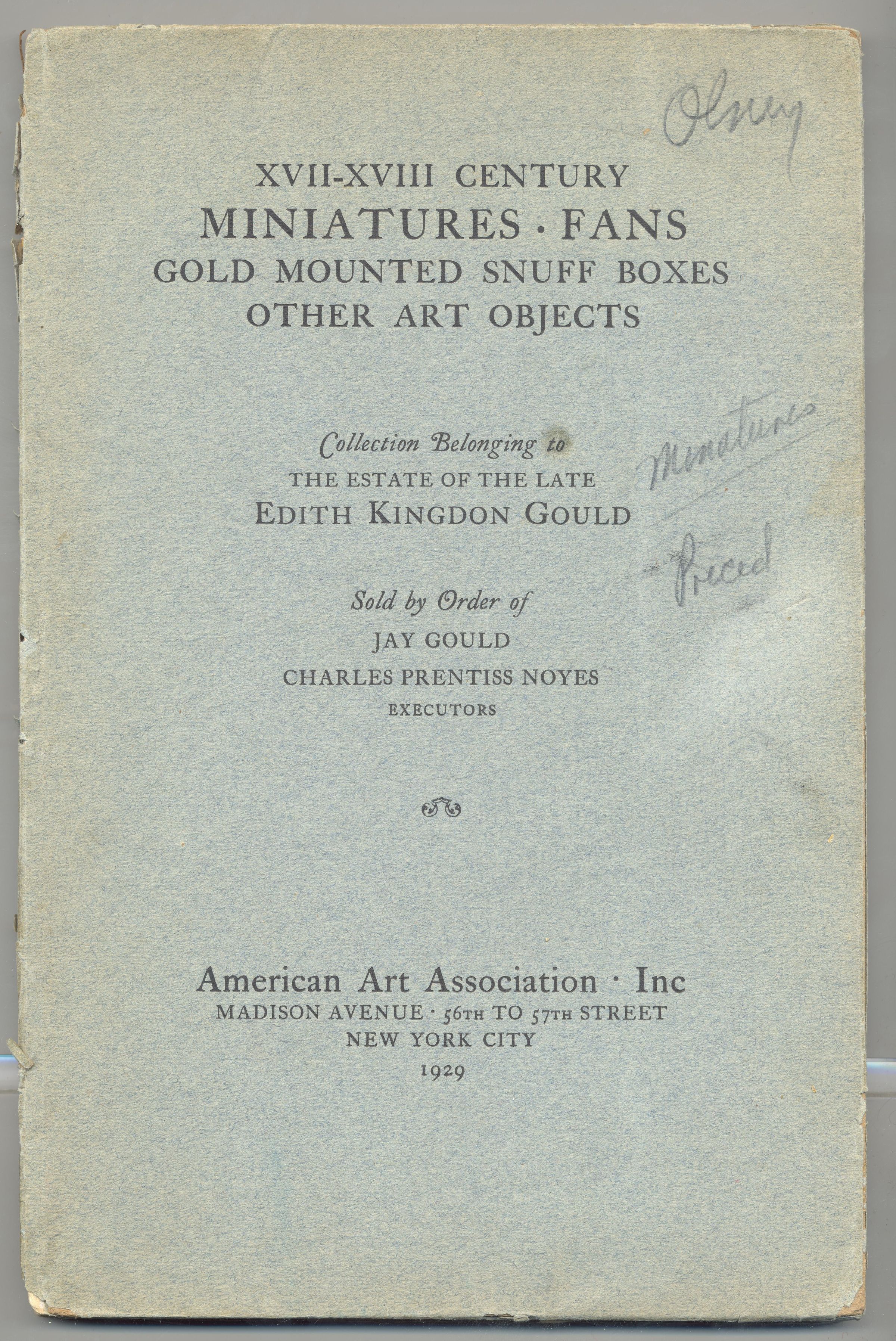 CAT, ART, 1929, NY. 17TH AND 18TH CENTURY MINIATURES, FANS, SNUFF BOXES, AMERICAN ART ASSOC. B/W PHOTOS, PRICES WRITTEN, 93 PP. 7" X 10 1/2"Created By