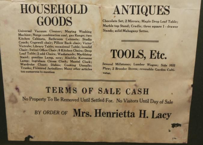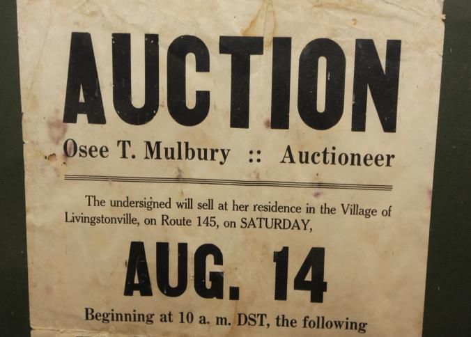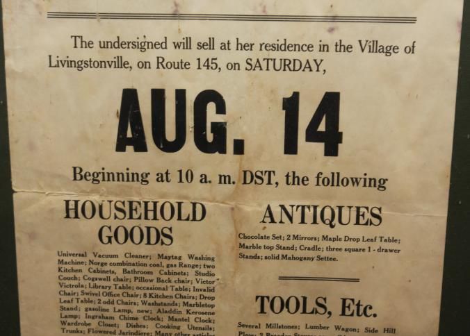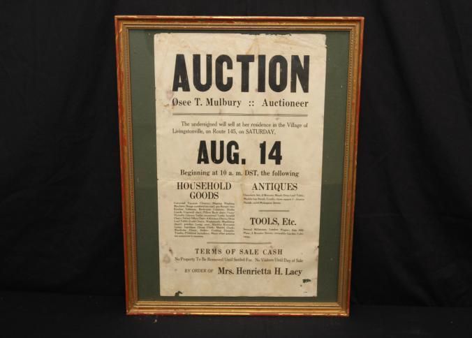 FR. C-1930'S NY. HOUSEHOLD, ANTIQUES & TOOLS AUCTION BROADSIDE. 12X19". AUCTIONEER OSEE T. MULBURY WAS SELLING BY ORDER OF MRS. HENRIETTA H. LACY T HER RESIDENCE IN THE VILLAGE OF LIVINGSTONVILLE, ON ROUTE 145 (OUTSIDE ALBANY, NY) ON SAT. AUG. 14 AT 10AM. A COUPLE OF PHRASES THAT SEEMED TO BECOME POPULAR FROM ABOUT 1930 "NO PROPERTY TO BE REMOVED UNTIL SETTLED FOR" AND "NO VISITORS UNTIL DAY OF SALE." DETAILED LISTING. TERMS - CASH.Created By