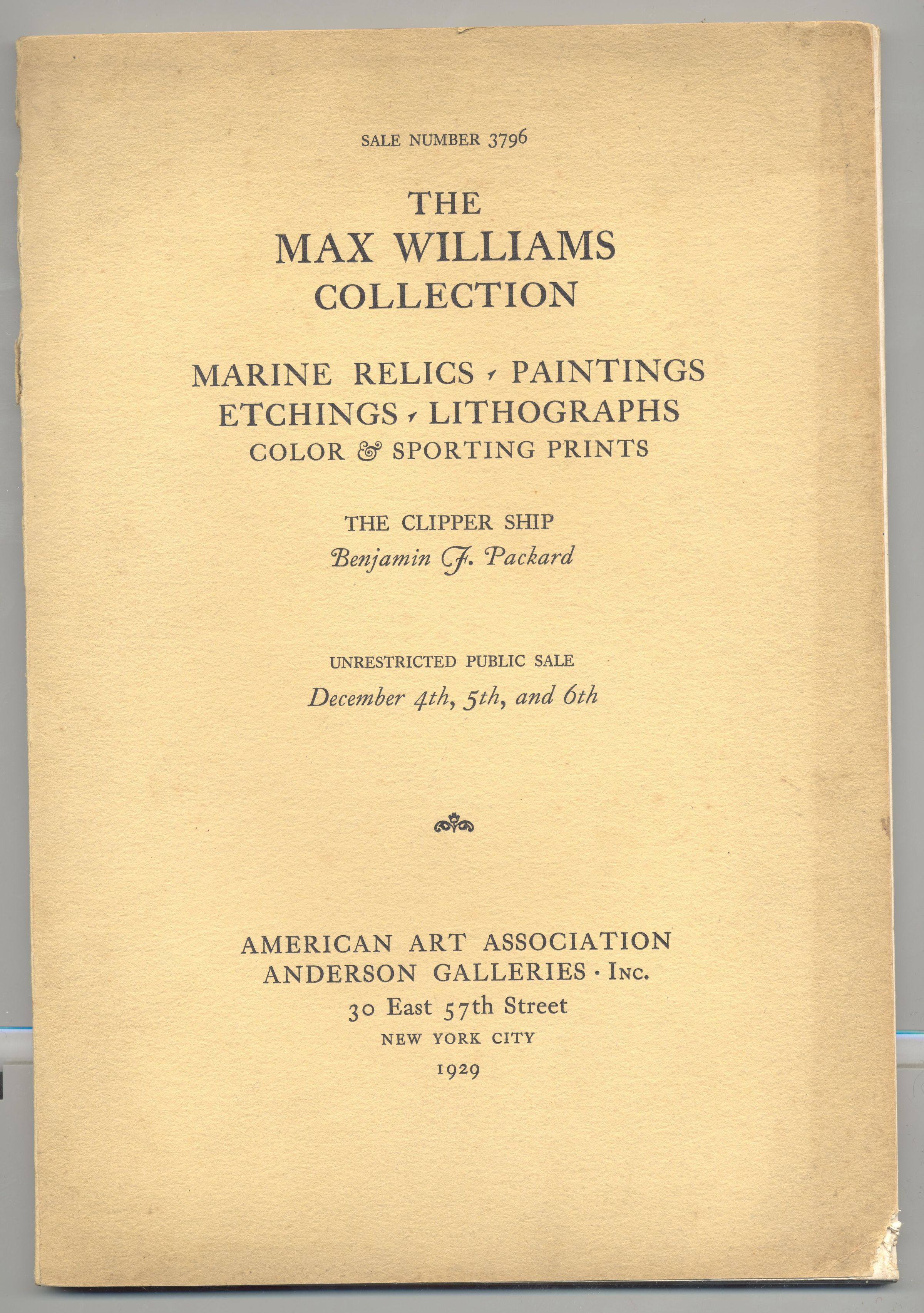 CAT, ART, 1929, NY. PAINTINGS, ETCHINGS, MARINE RELICS, LITHOGRAPHS, AND "THE CLIPPER SHIP" BY PACKARD. AMERICAN ART ASSOC. ANDERSON GALLERIES. SALE NO. 3796, PARKE, BERNET, BADE, RUSSEL JR, AUCTS. 91 PP. 7 1/4" X 10 1/2"Created By