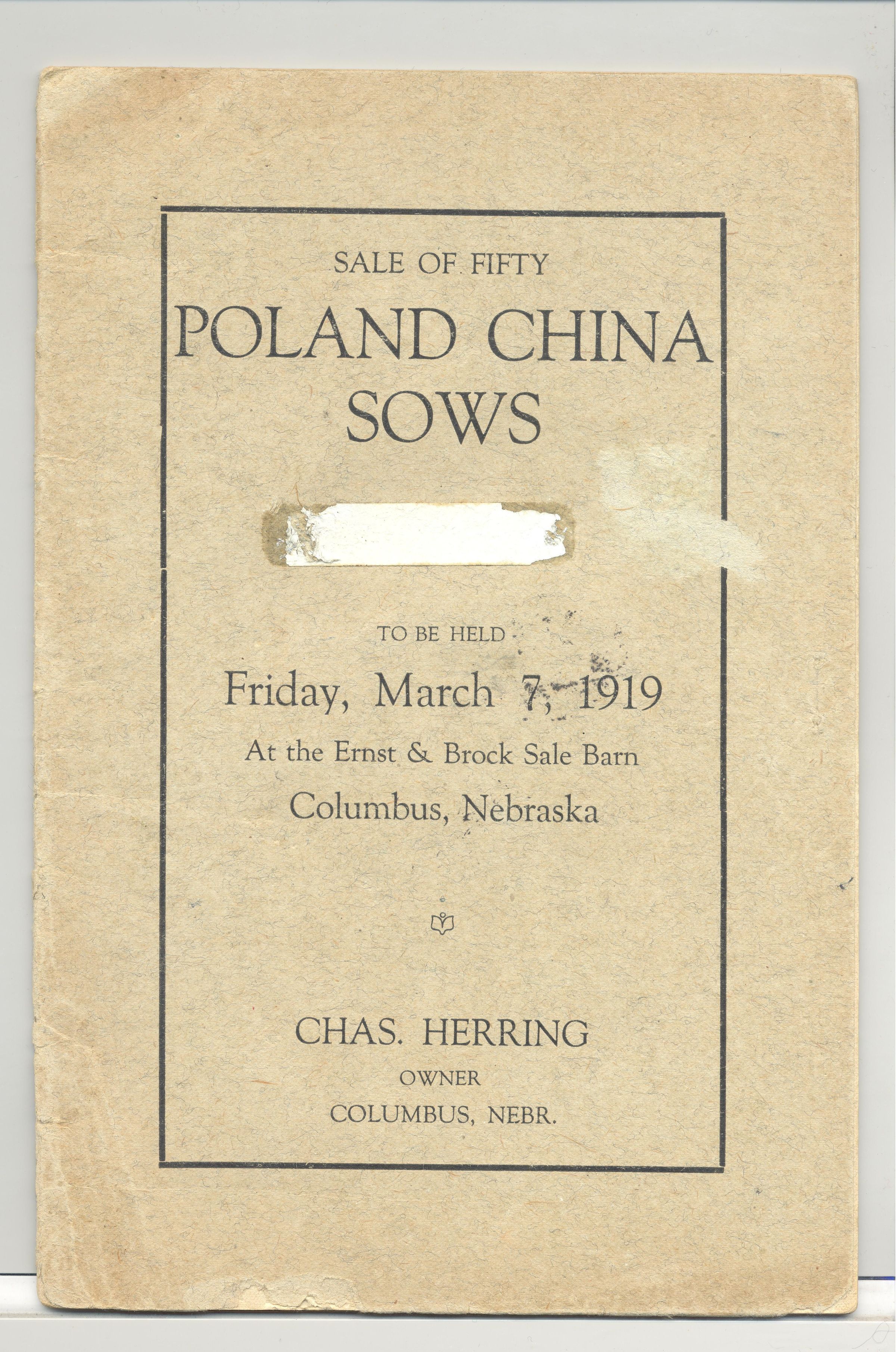 CAT, PIGS, 1919, NE. SALE OF 50 POLAND CHINA SOWS. ERNST & BROCK LIVERY BARN, COLUMBUS. 20 PP. 5 3/4" X 8 3/4"Created By
