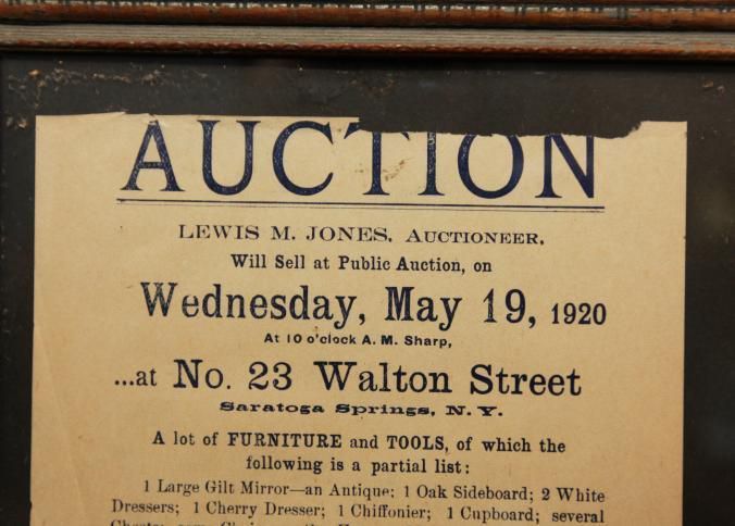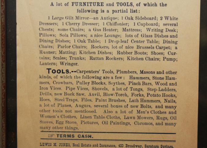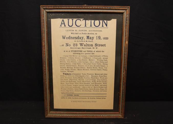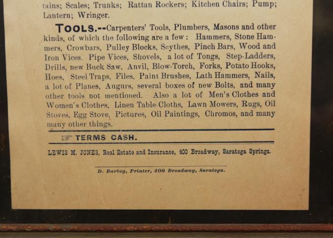 FR. 1920 NY. "FURNITURE & TOOLS" AUCTION BROADSIDE. 6X8". AUCTIONEER LEWIS M. JONES (REAL ESTATE & INSURANCE ALSO) FROM 400 BROADWAY, SARATOGA SPRINGS, NY WAS SELLING ON WED. MAY 19TH AT 10AM SHARP A DETAILED LISTING OF FURNITURE AND TOOLS. TERMS - CASH.Created By