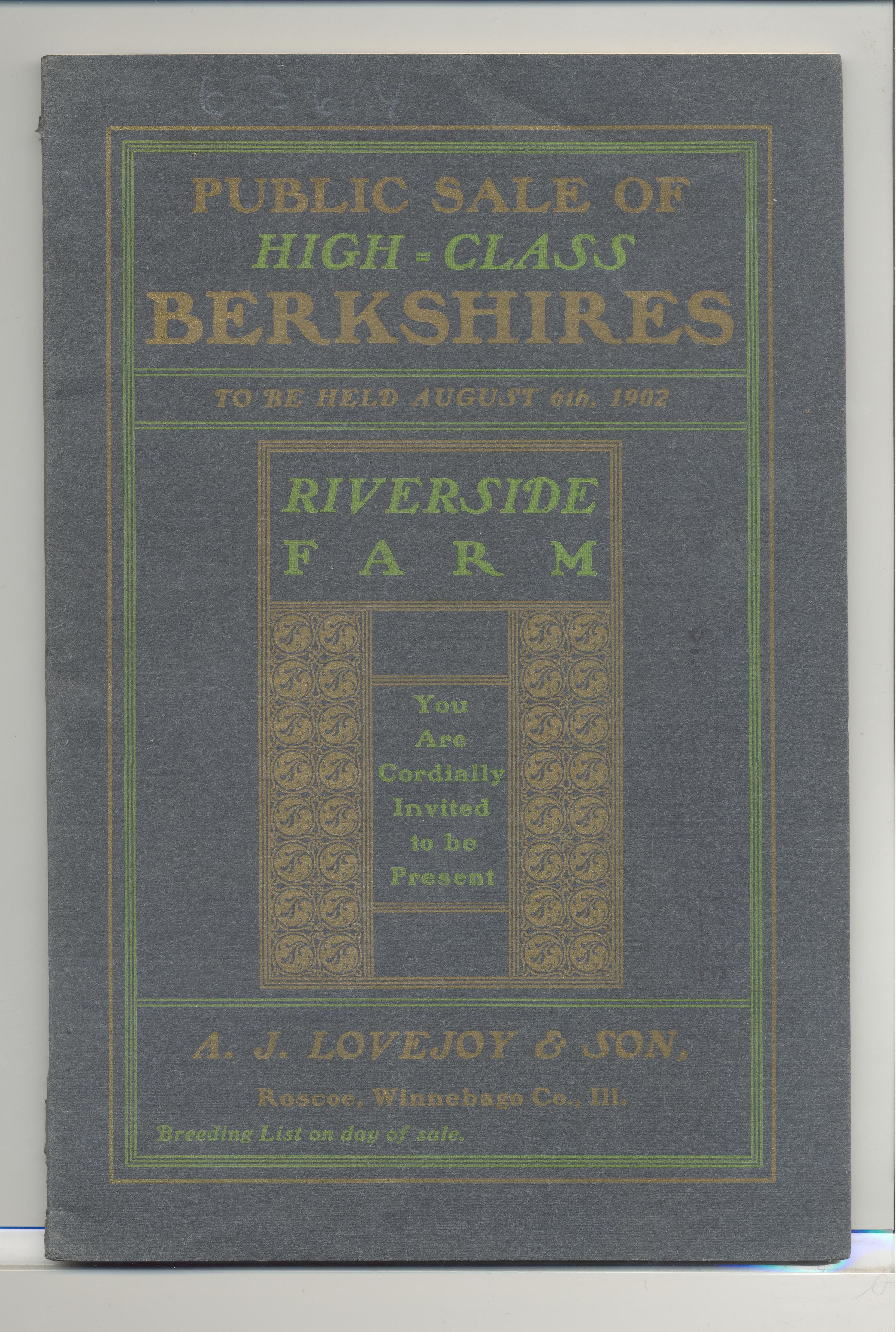 CAT, PIGS, 1902, IL. PUBLIC SALE OF HIGH CLASS BERKSHIRES, RIVERSIDE FARM. B/W DRAWINGS, 38 PP. 6" X 8 3/4"Created By
