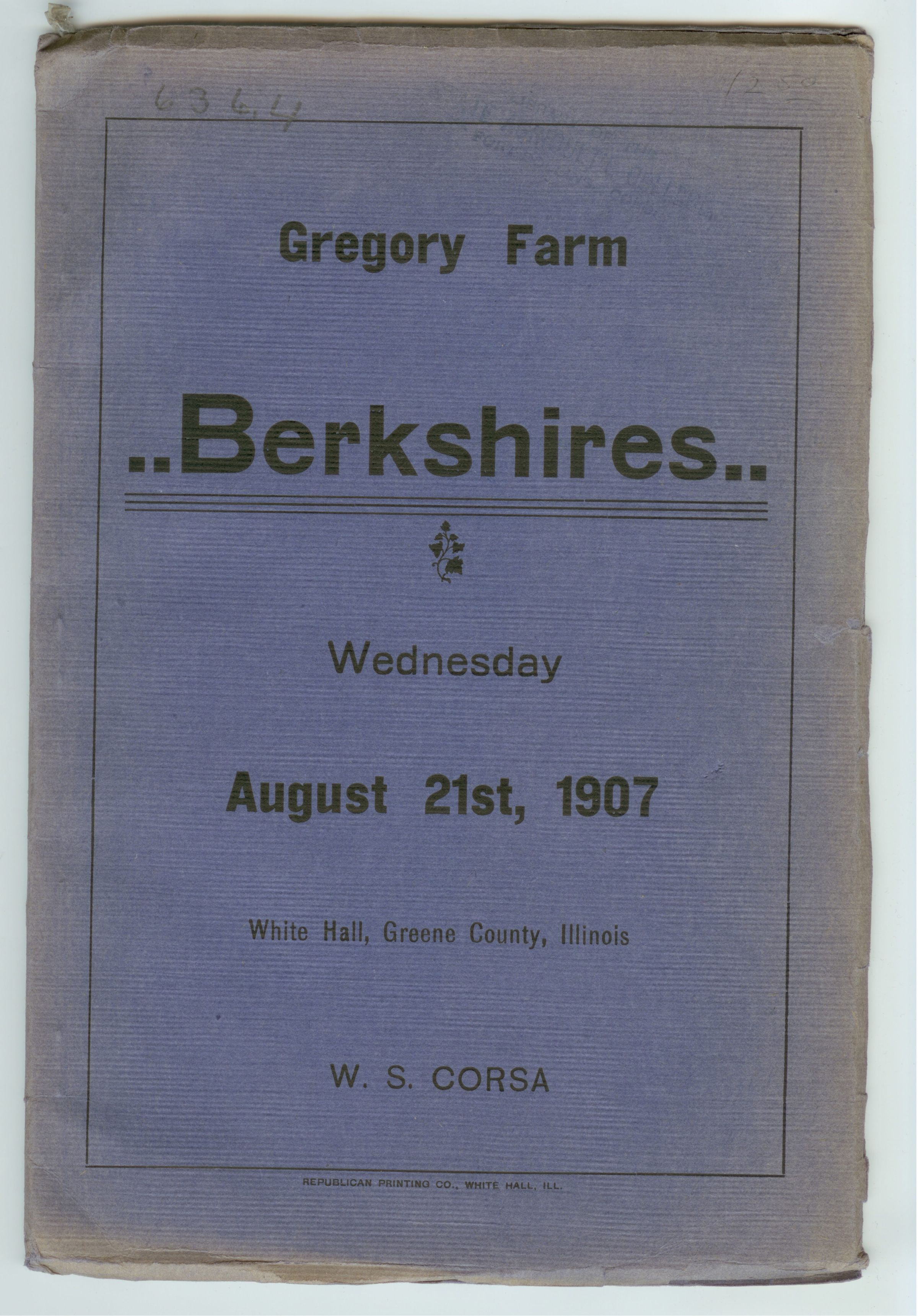 CAT, PIGS, 1907, IL. GREGORY FARM BERKSHIRES. COL. F.M. WOODS, AUCTIONEER. B/W ILLUST. 64 PP. 6" X 9"Created By
