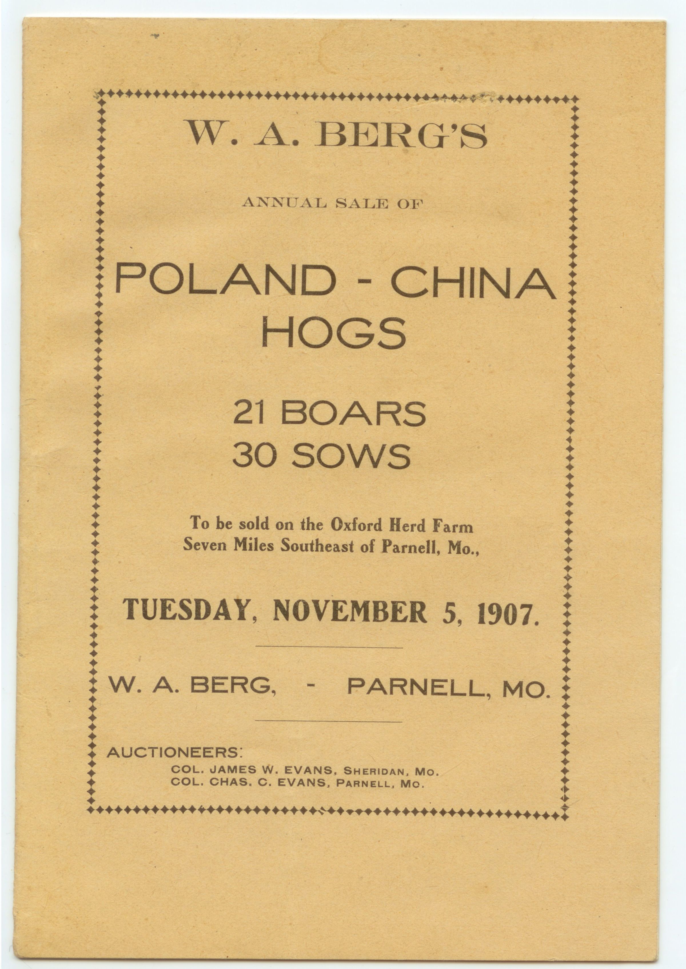 CAT, PIGS, 1907, MO. W.A. BERG'S ANNUAL SALE OF POLAND-CHINA HOGS. COL.'S JAMES & CHAS. EVANS, AUCTIONEERS. PRICES WRITTEN, 14 PP. 6" X 8 1/2"Created By