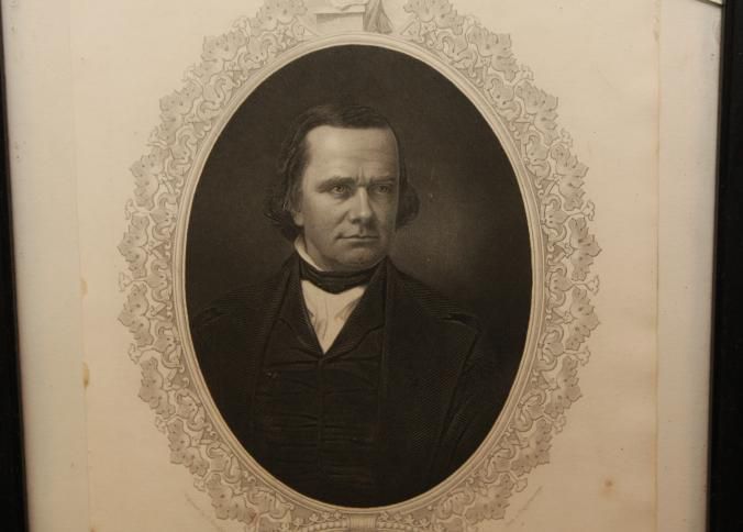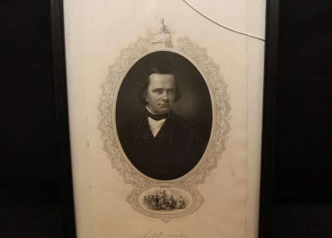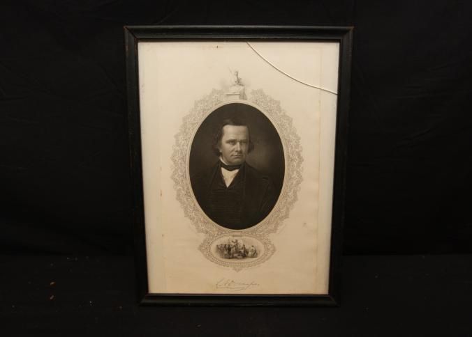 FR. PHOTO OF SENATOR STEPHEN ARNOLD DOUGLASS, AUCTIONEER. 6 1/2X9 1/2". ACTUALLY AN ENGRAVING OF SENATOR DOUGLAS, STANDING ABOUT 4 1/2 FEET TALL, HE WAS KNOWN AS "THE LITTLE GIANT" WHEN HE DEBATED ABRAHAM LINCOLN BACK IN THE TIME OF SLAVERY IN AMERICA. THIS BOOKPLATE PAGE HAS HIS PORTRAIT AS TAKEN FROM A DAGUEREOTYPE OVER A VIGNETTE OF AN AUCTION WITH DOUGLAS AS THE AUCTIONEER. A COPY OF HIS SIGNATURE BELOW.Created By