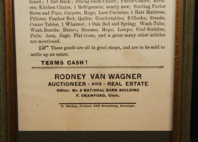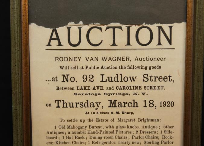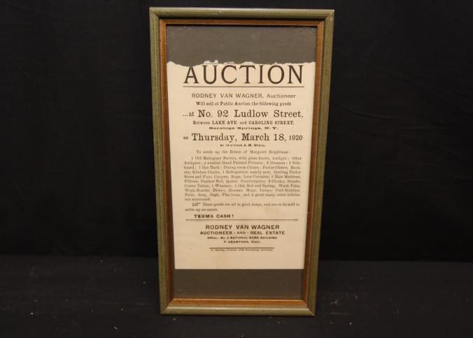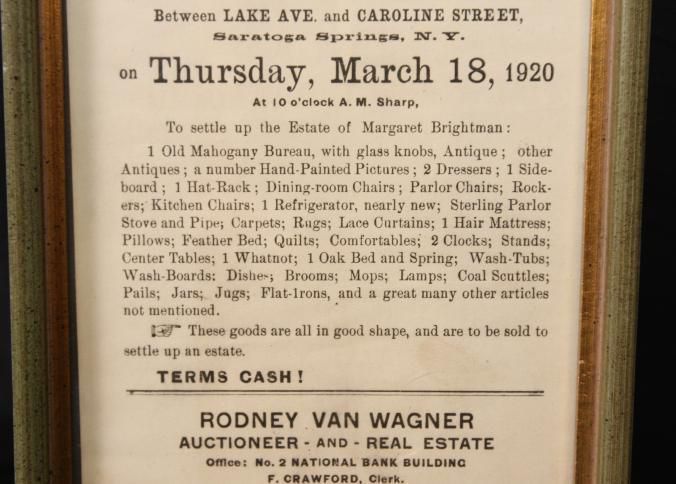 FR. 1920 NY. ESTATE AUCTION BROADSIDE. 5X8". RODNEY VAN WAGNER, AUCTIONEER AND REAL ESTATE AGENT WITH OFFICES AT NO. 2 NATIONAL BANK BUILDING SARATOGA SPRINGS, NY WAS SELLING THE ESTATE OF MARGARET BRIGHTMAN AT NO. 92 LUDLOW ST. SARATOGA SPRINGS, NY ON THURS. MAR. 18 AT 10AM. GREAT LISTING OF PERSONAL PROPERTY, MUCH OF WHICH WOULD BE CONSIDERED ANTIQUES TODAY.Created By