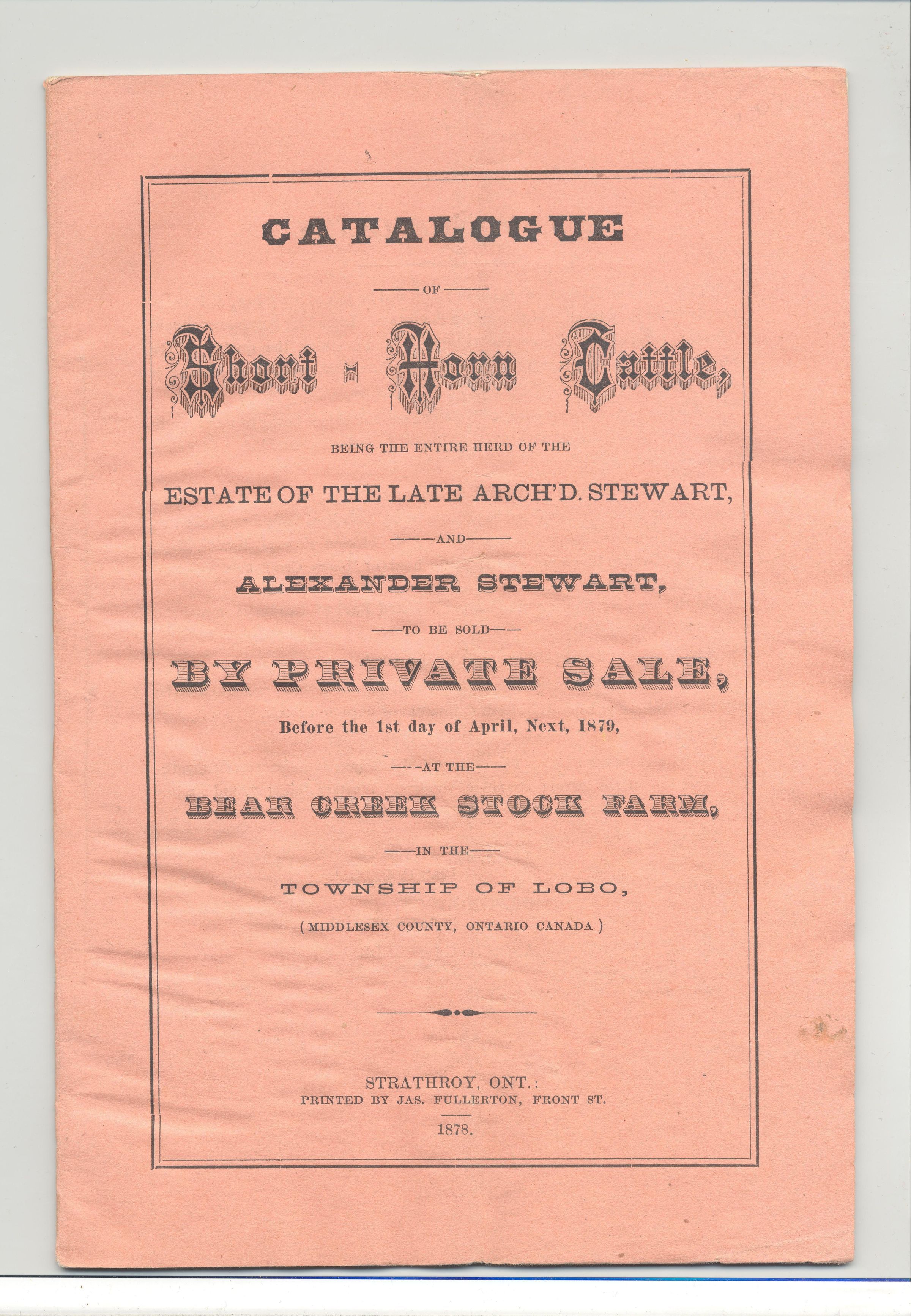 CAT, CATTLE, 1879, ONTARIO, CANADA. SHORTHORNS, BEAR CREEK STOCK FARM, TOWNSHIP OF LOBO. 28 PP. 5 1/2" X 8 1/2"Created By