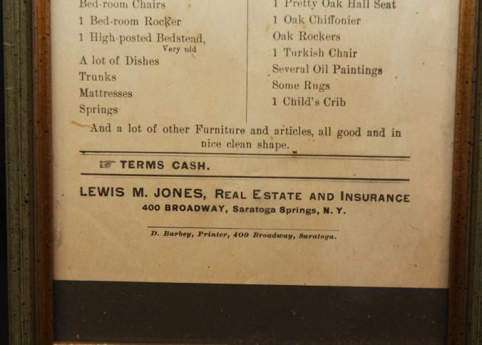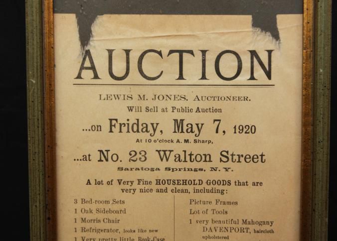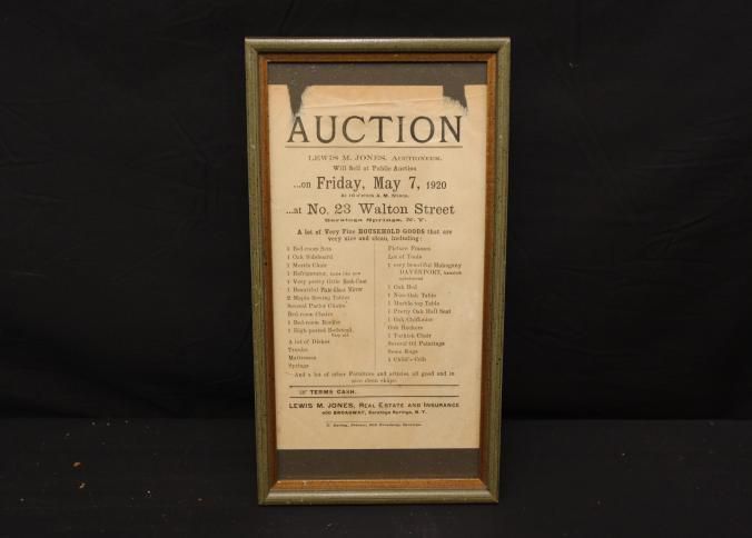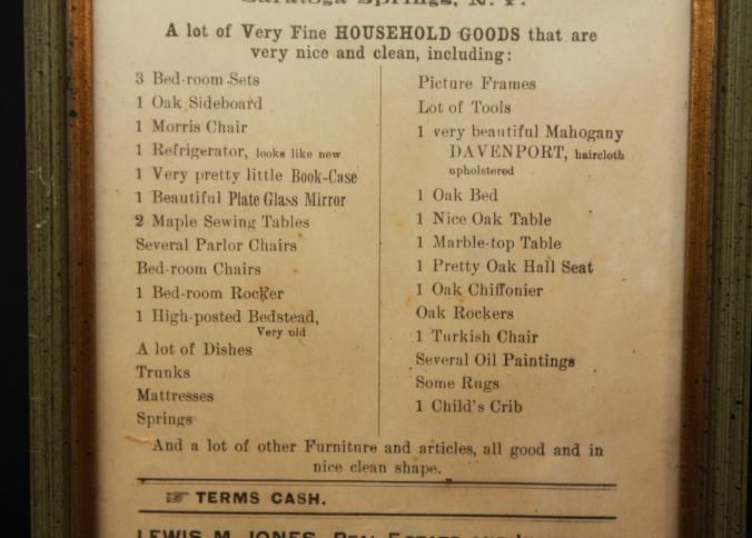 FR. 1920 NY. HOUSEHOLD AUCTION BROADSIDE. 5 1/2X9". AUCTIONEER LEWIS M. JONES WAS SELLING A LOT OF VERY FINE HOUSEHOLD GOODS THAT ARE VERY NICE AND CLEAN ON FRI. MAY 7TH AT NO. 23 WALTON STREEET SARATOGA SPRINGS, NY. TERMS CASH. GREAT DETAILED LISTING.Created By