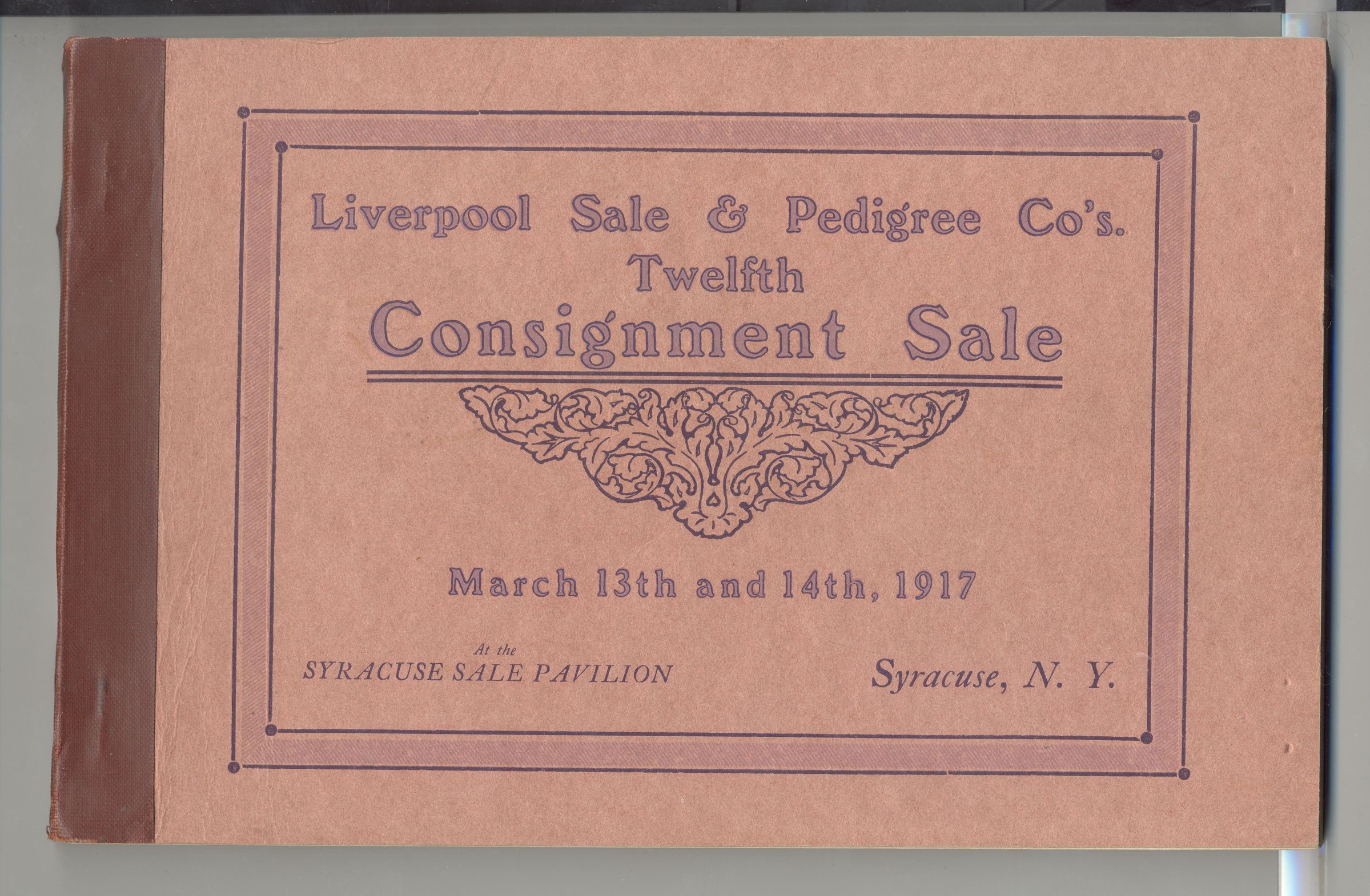 CAT, CATTLE, 1917, NY. 12TH CONSIGNMENT SALE, PURE BRED HOLSTEIN-FRIESIAN CATTLE AT THE SYRACUSE SALE PAVILION. COL. B.V. KELLEY, R.E. HAEGER, AUCTS. A FEW PRICES, 8 3/4" X 5 3/4" 3/8" THICK.Created By