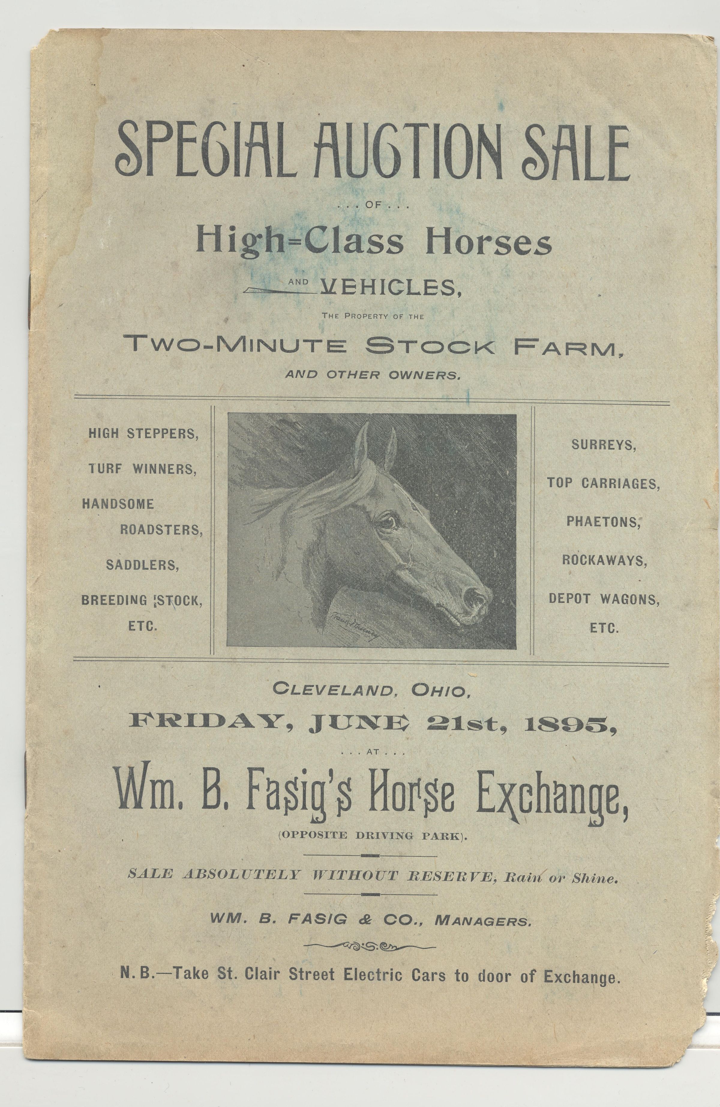 CAT, HORSE, 1895, OH. SPECIAL AUCTION SALE OF HIGH-CLASS HORSES AND VEHICLES. WM FASIG'S HORSE EXCHANGE. 18 PP. 6" X 9"Created By