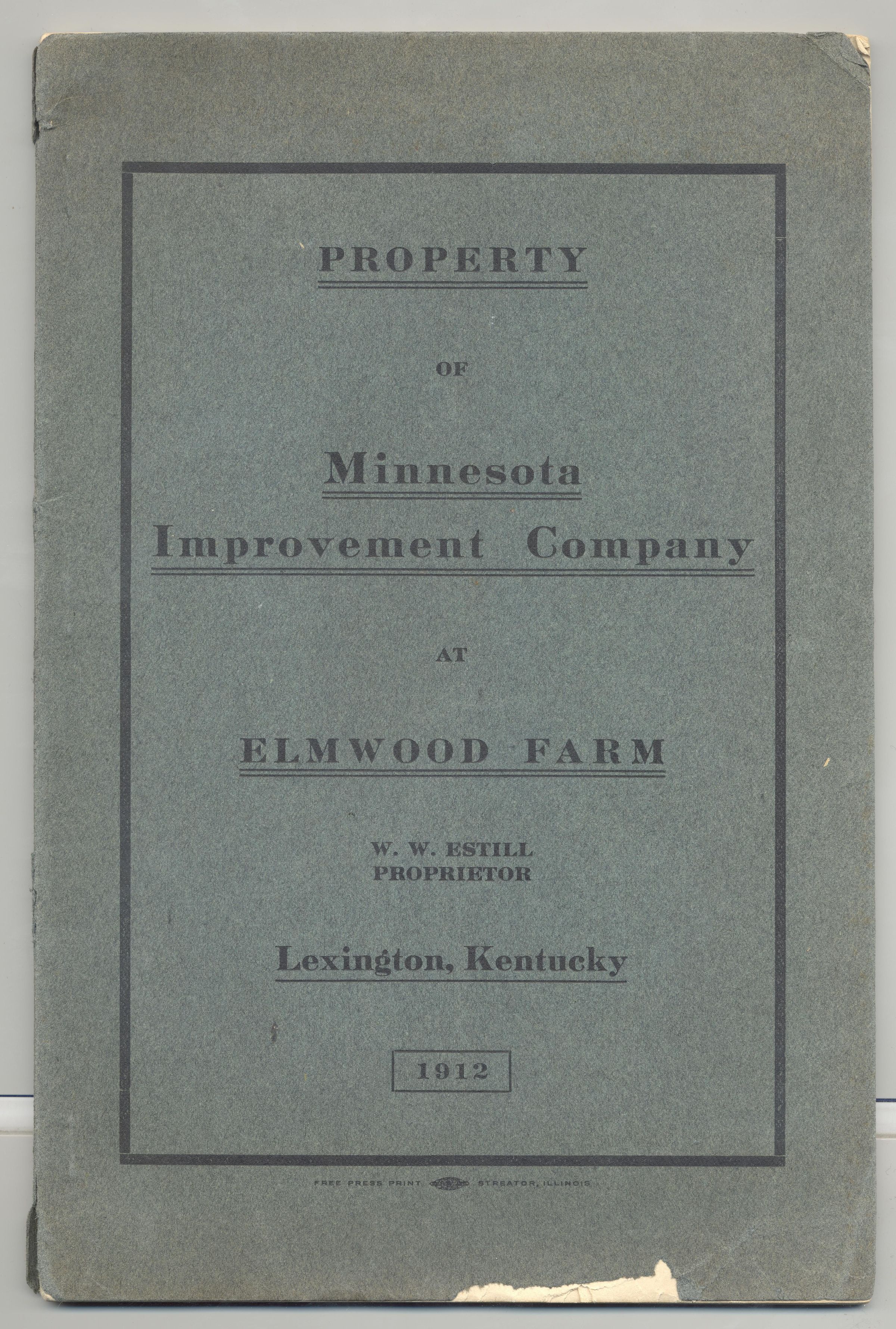 CAT, HORSE, 1912, KY. PROPERTY OF MINNESOTA IMPROVEMENT CO AT ELMWOOD FARM. 53 PP. 6 3/4" X 10 1/4"Created By