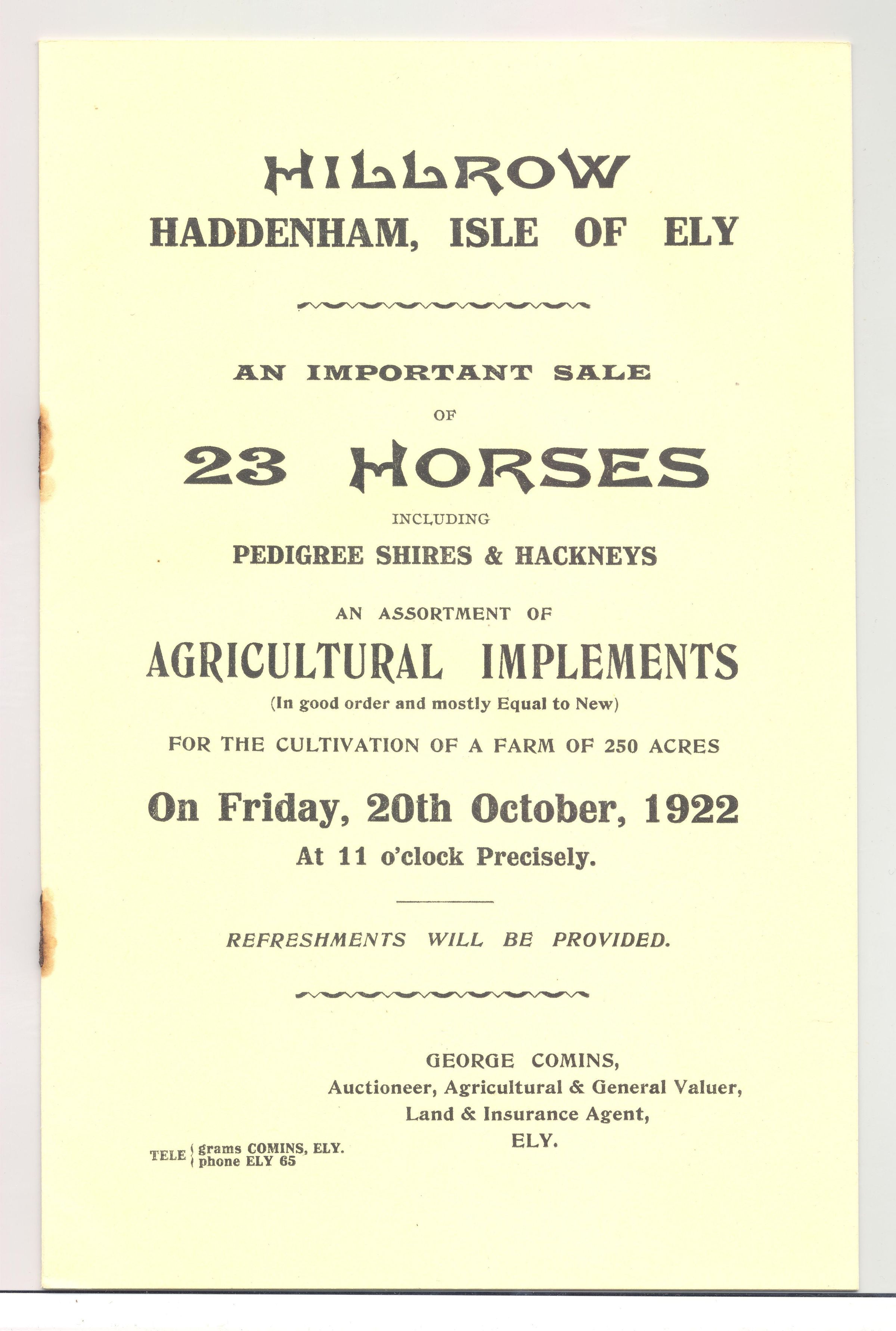CAT, HORSE, 1922, HILLROW, HADDENHAM, ISLE OF ELY. (ENGLAND?) GEORGE COMINS, AUCT. 10 PP. 5 1/2" X 8 1/2"Created By