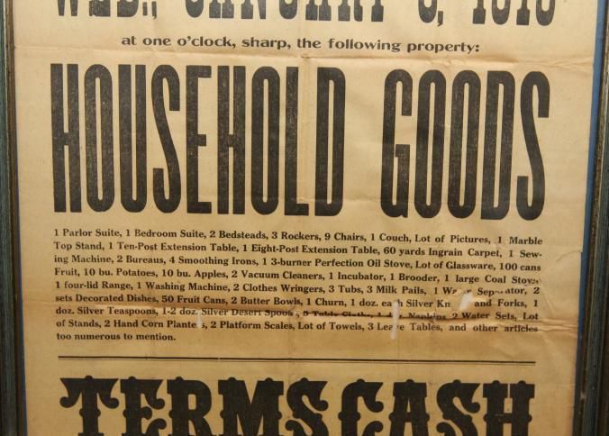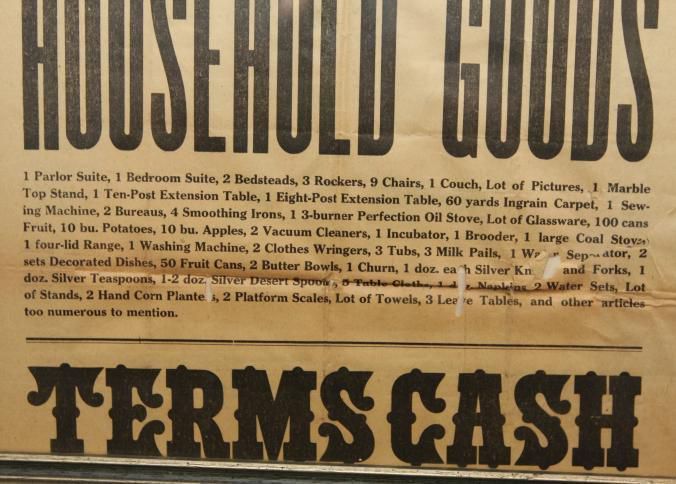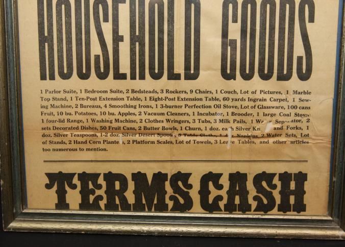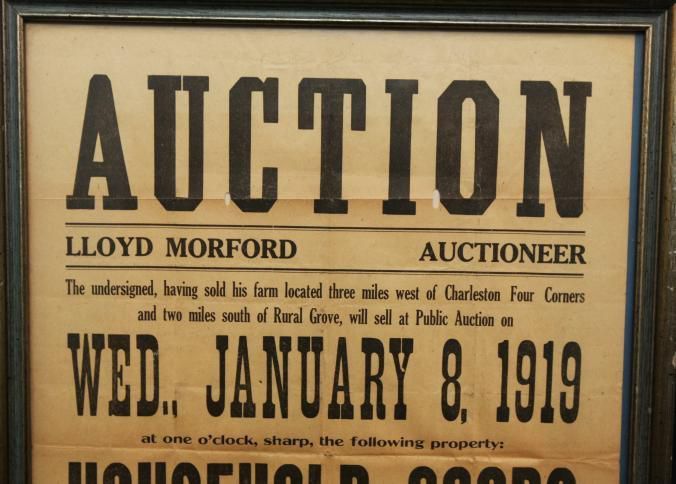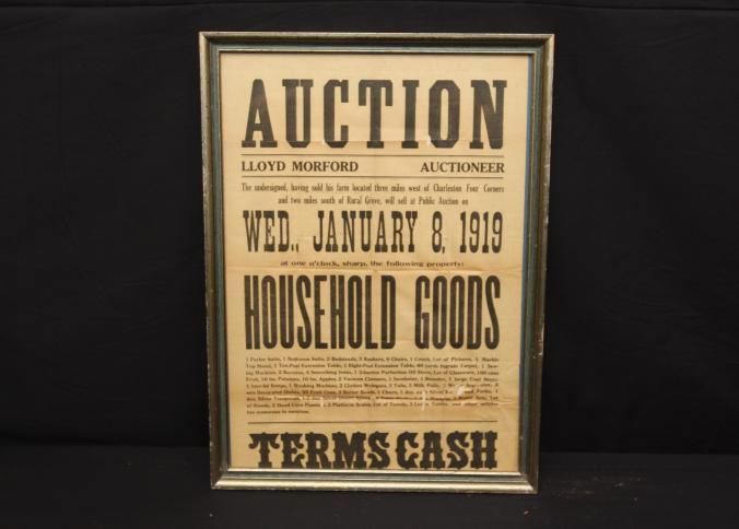 FR. 1919 HOUSEHOLD GOODS AUCTION BROADSIDE. 12 1/2 X 16 1/2". HAVING SOLD THE FARM, AUCTIONEER LLOYD MORFORD WILL SELL AT ONE O'CLOCK ALL THE CONTENTS. TERMS CASH.Created By