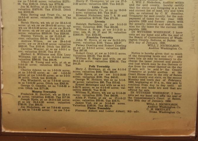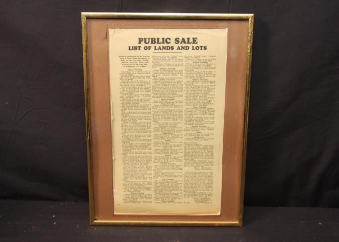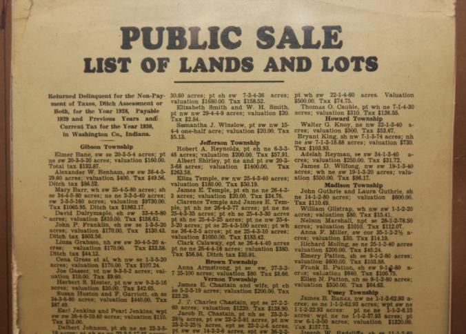 FR. 1930 IND. "TAX FORECLOSED REAL ESTATE" AUCTION BROADSIDE. 8X13". A LONG LIST OF PROPERTIES FROM WASHINGTON COUNTY, INDIANA. LISTED BY TOWNSHIPS. THE AUCTION WAS SCHEDULED FOR MON. FEB. 10TH 1930 AND TO CONTINUE FROM DAY TO DAY UNTIL ALL SAID LOTS AND LANDS ARE SOND THAT ARE OFFERED FOR SALE. HAS LISTING OF DEBTOR, TAX MAP NUMBER, VALUATION, SIZE OF PARCEL AND AMOUNT OWED ON EACH PARCEL.Created By