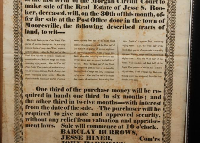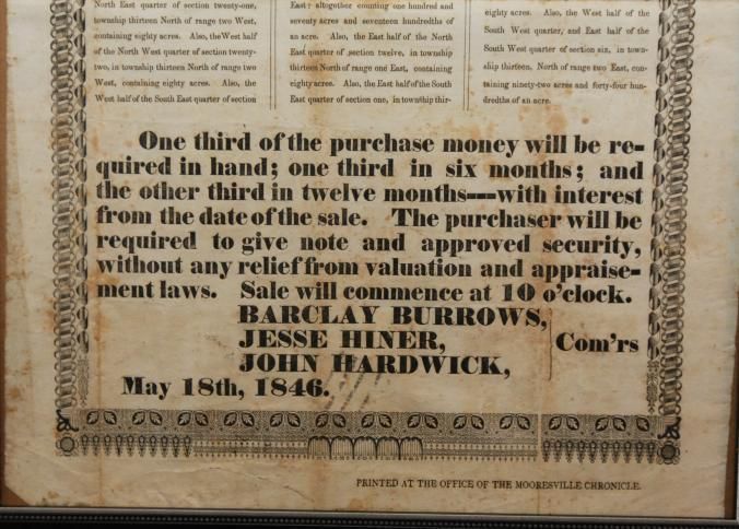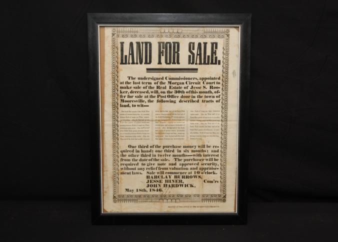 FR, AD, 1846, REAL ESTATE, MOORESVILLE. (NO STATE), BURROWS, HINER, HARDWICK, COMMISSIONERS. PRINTED AT THE OFFICE OF THE MOORESVILLE CHRONICLE. 12 1/2" X 15 1/2"Created By