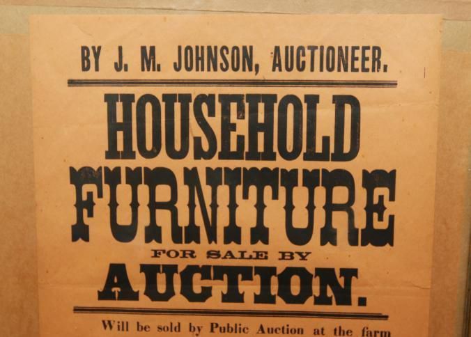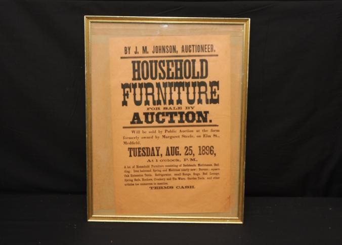 FR. 1896 MA. HOUSEHOLD AUCTION BROADSIDE. 11X15". AUCTIONEER J.M. JOHNSON WAS SELLING FOR MARGARET STEELE ON ELM ST. MEDFIELD ON TUES. AUG. 25, 1896 AT 1 O'CLOCK PM, A LOT OF HOUSEHOLD FURNITURE CONSISTING OF BEDSTEADS, MATTRASSES, BEDDING AND MUCH MORE. TERMS CASH.Created By