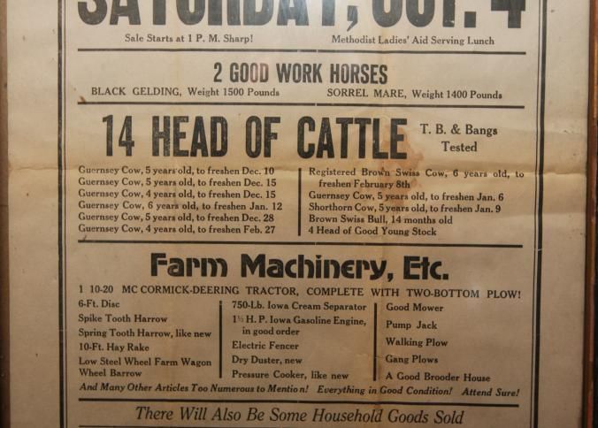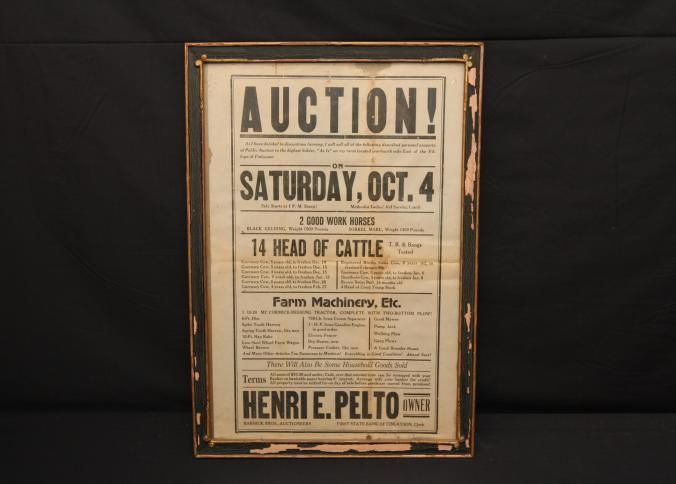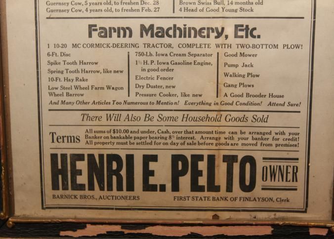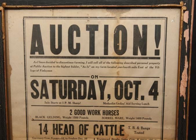 FR. C-1920'S MINN. FARM LIQUIDATION AUCTION BROADSIDE. 11X17" AUCTIONEERS, BARNICK BROS., WERE SELLING FOR HENRI E. PELTO, WHO HAS DECIDED TO DISCONTINUE FARMING AND HAVE A PUBLIC AUCTION TO THE HIGHEST BIDDER, "AS,IS" ON HIS FARM LOCATED 1/4 MILE EAST OF THE VILLAGE OF FINLAYSON ON SAT. OCT. 4 AT 1PM SHARP. "METHODIST LADIES' AID SERVING LUNCH" ( NO "FREE LUNCH" AND WORD "SHARP" BOTH INDICATE 1920'S AUCTION). NO YEAR AS AUCTIONS WERE LOCAL EVENTS AND EVERYONE NEW WHAT YEAR IT WAS. GREAT LISTING OF LIVESTOCK INCLUDING 2 GOOD WORK HORSES - BLACK GELDING - 1500 LBS, AND SORREL MARE - 1400 LBS. 14 HEAD OF CATTLE ALL LISTED, NICE LISTING OF FARM MACHINERY. "THERE WILL ALSO BE SOME HOUSEHOLD GOODS SOLD." TYPICAL "MANY OTHER ARTICLES TOO NUMEROUS TO MENTION" HERE'S A NEAT LINE NOT ENCOUNTERED OFTAIN "EVERYTHING IN GOOD CONDITION! ATTEND SURE!"Created By