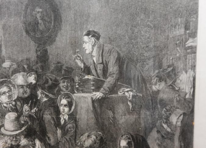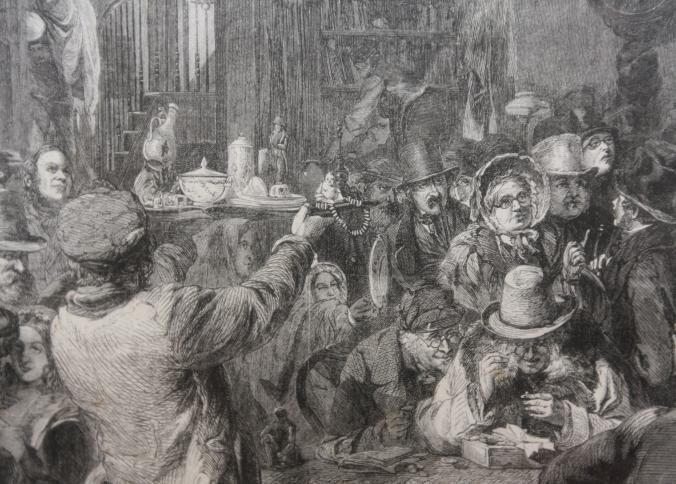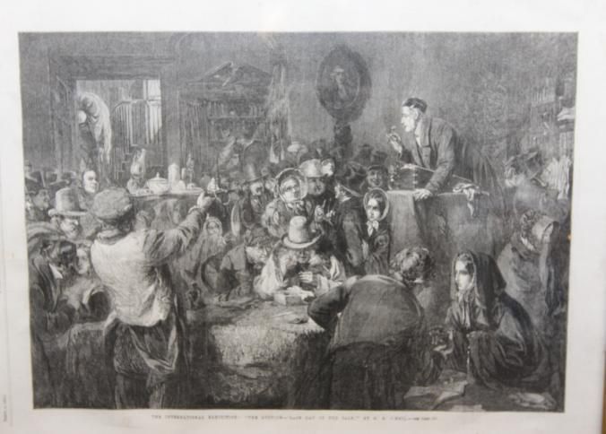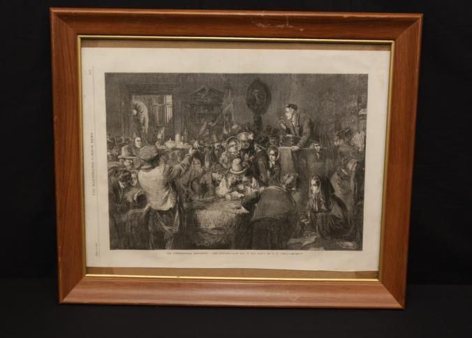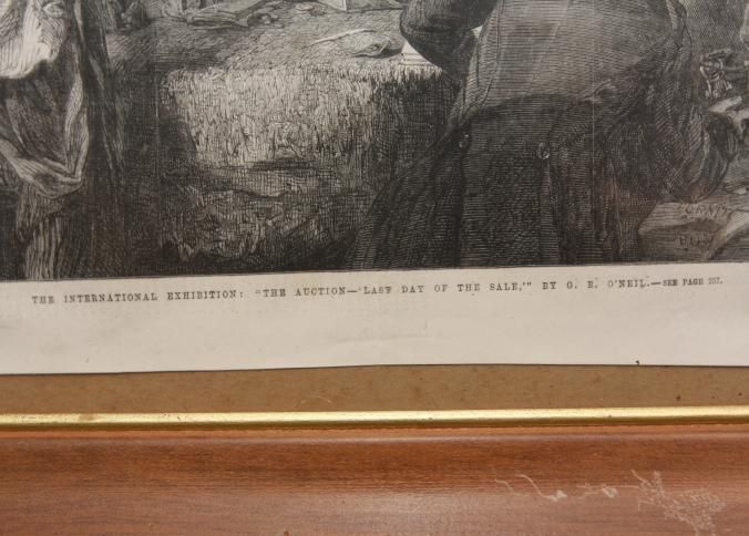 FR. 1862 ENGRAVING "THE INTERNATIONAL EXHIBITION: THE AUCTION - LAST DAY OF THE SALE." 11X15". A FULL PAGE FROM THE ILLUSTRATED LONDON NEWS PAPER. APPEARS THAT THE AUCTION WAS IN A COFFEE HOUSE WITH AUCTIONEER UP HIGH OVER LOOKING THE SEATED AND STANDING CROWD THAT IS BIDDING AND PREVIEWING. VERY DETAILED SCENE.Created By