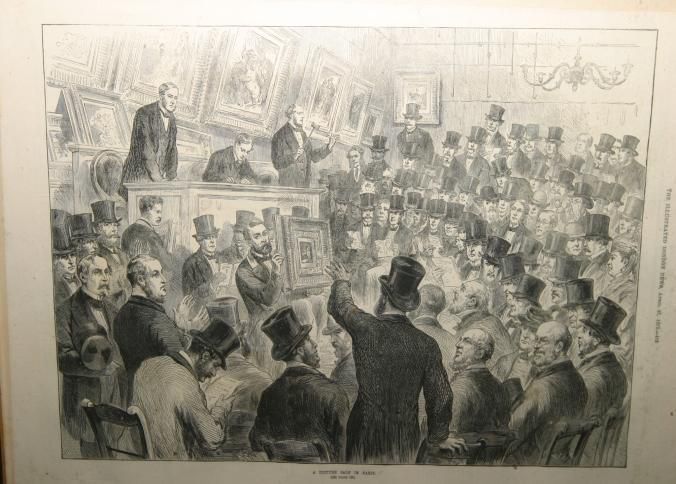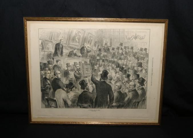 FR PRINT, 1872, ART AUCTION. FROM THE ILLUSTRATED LONDON NEWS, "A PICTURE SALE IN PARIS" CROWD OF MEN WITH TOP HATS ON AT AUCTION. 17" X 12 1/2"Created By