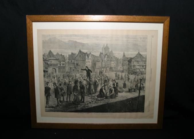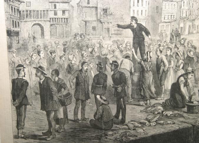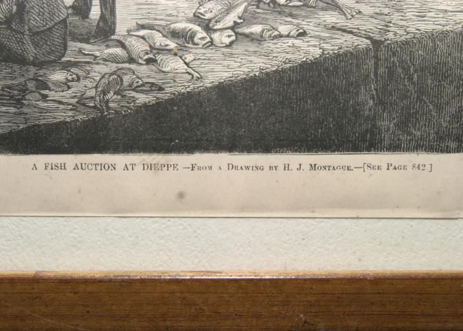 FR ENGRAVING, FISH AUCTION, 1874. PRINTED IN HARPER'S BAZAR. "A FISH AUCTION AT DIEPPE - FROM A DRAWING BY H.J. MONTAGUE" 18" X 14"Created By