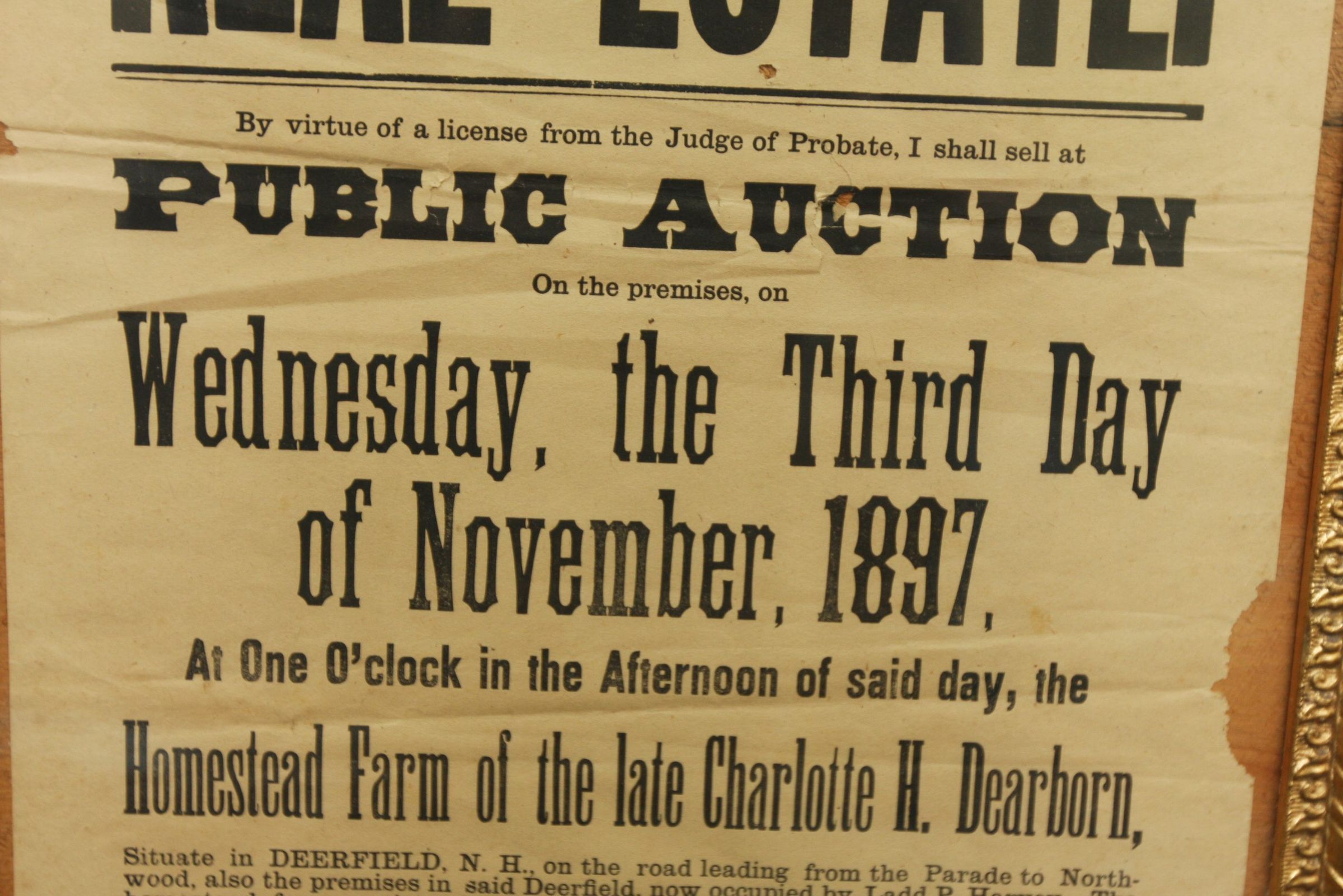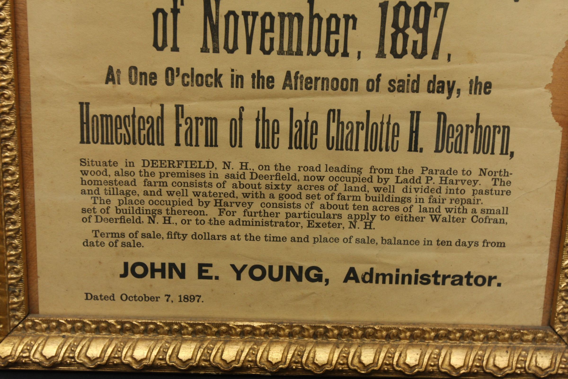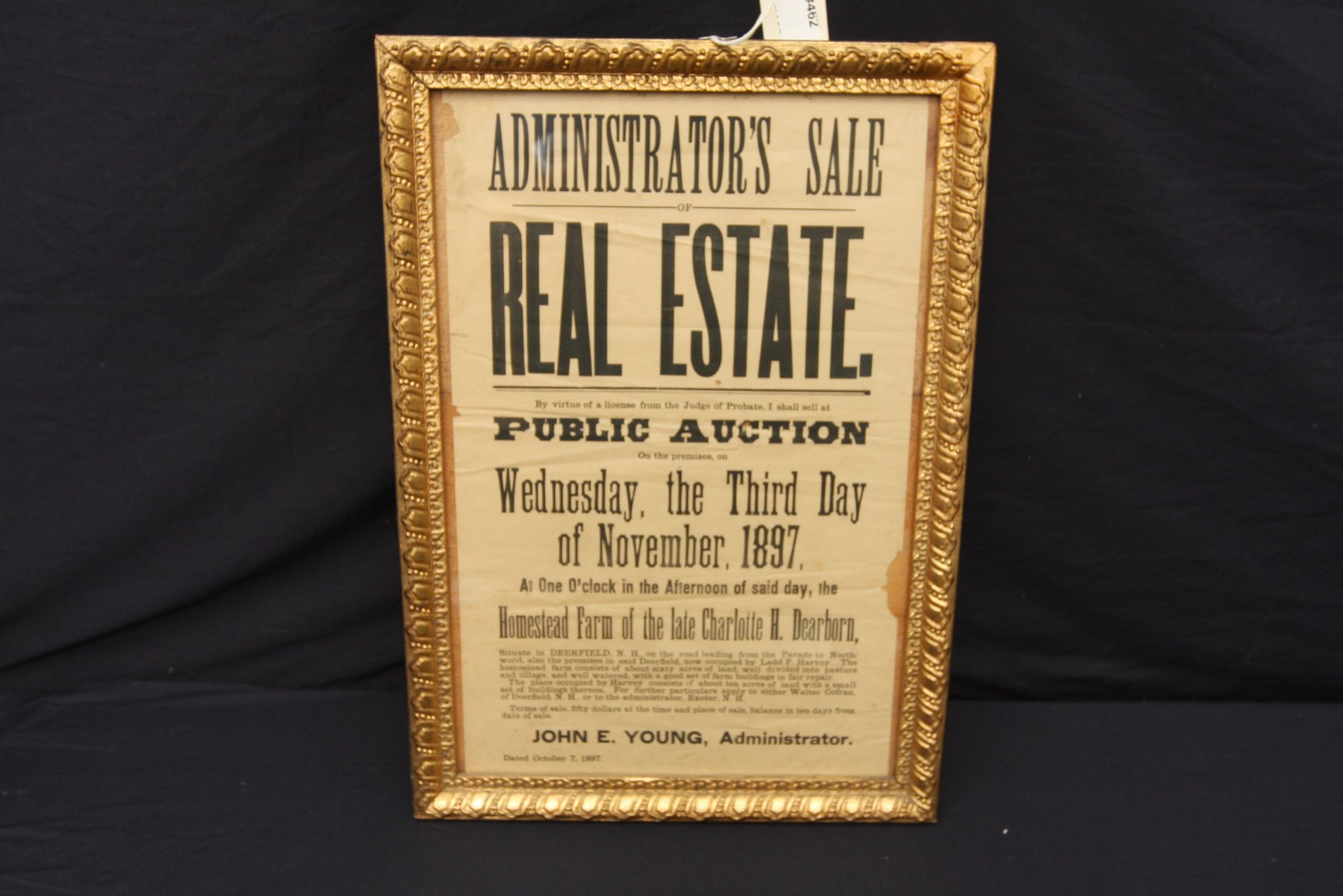 FR BROADSIDE, REAL ESTATE, 1897, NH. ADMINISTRATOR'S SALE OF REAL ESTATE. HOMESTEAD FARM IN DEERFIELD, NH. JOHN E YOUNG, ADMIN. 15 1/2" X 22"Created By