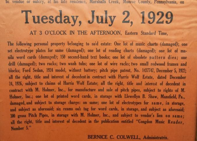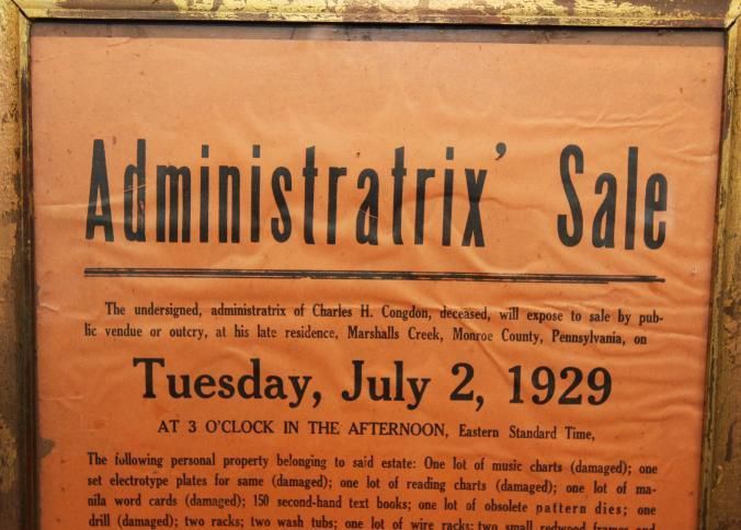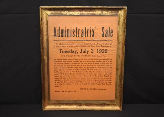 FR. 1929 PA. "ADMINISTRATRIX SALE" 14X16". A VERY UNIQUE ESTATE BROADSIDE. THE WOMAN HANDLING THE ESTATE, BERNICE C. COLWELL WS ORDERING THE SALE OF CHARLES H. CONGDON ESTATE. SHE "WILL EXPOSE TO SALE BY PUBLIC VENDUE OR OUTCRY, AT HIS LATE RESIDENCE, MARSHALLS CREEK, MONROE COUNTY, PENNSYLVANIA ON TUES. JULY 2, 1929 AT 3 O'CLOCK IN THE AFTERNOON, EASTERN STANDARD TIME (HAVEN'T SEEN "E.S.T." ON A BROADSIDE BEFORE, VERY LEGAL). THE LISTING IS VERY DETAILED, INCLUDING NOTATIONS OF DAMAGE. VERY UNUSUAL BROADSIDE.Created By