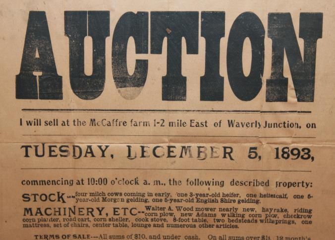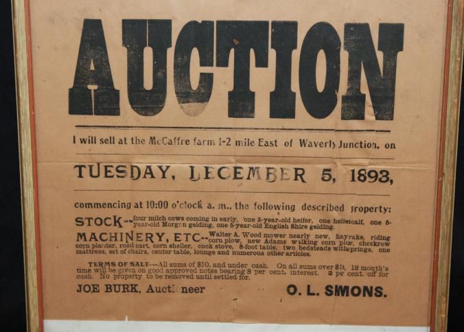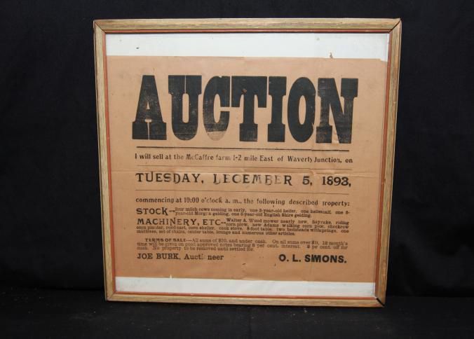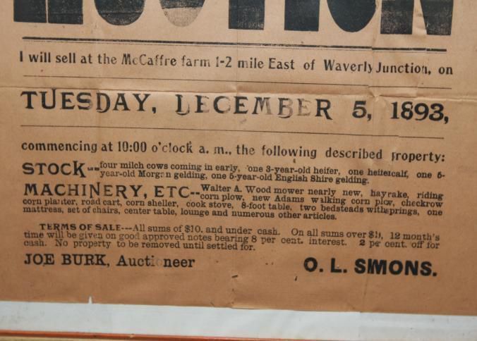 FR BROADSIDE, 1893, FARM STOCK AND MACHINERY, WAVERLY JCT. JOE BURK, AUCTIONEER. 12 1/2" X 11"